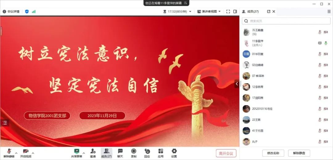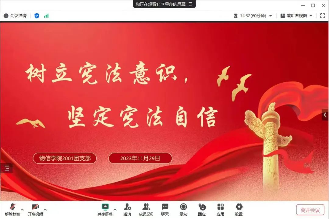 为树立法治意识,增强法治观念,公司2001团支部于2023年11月29日晚上20:30以线上腾讯会议的方式开展“树立宪法意识,坚定宪法自信”主题团日活动。本次团日活动由团支书李星萍主持。
