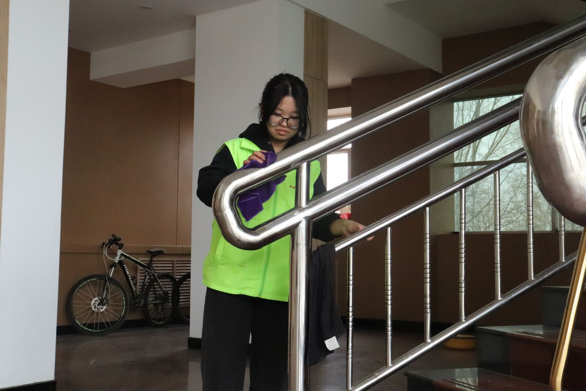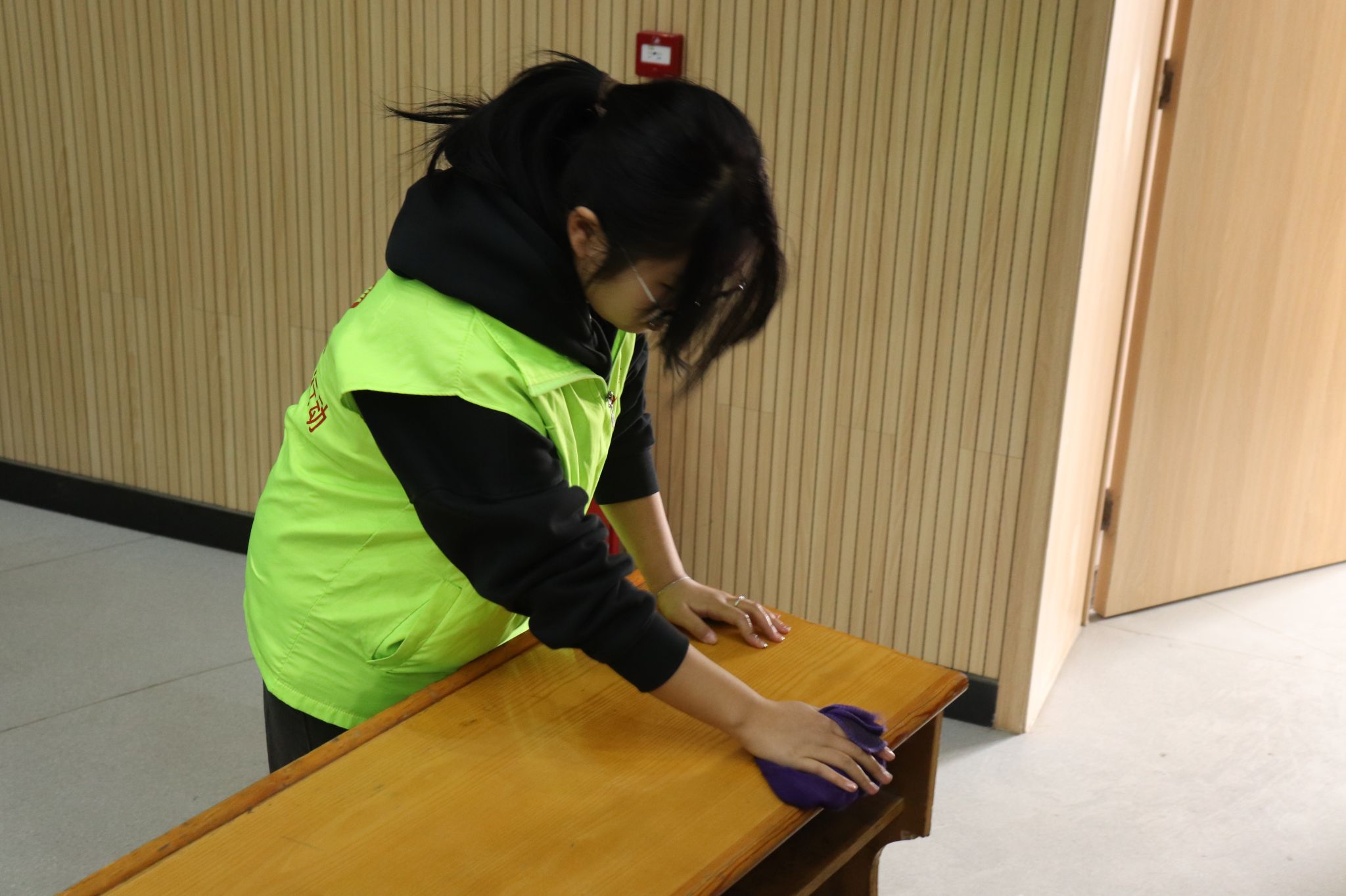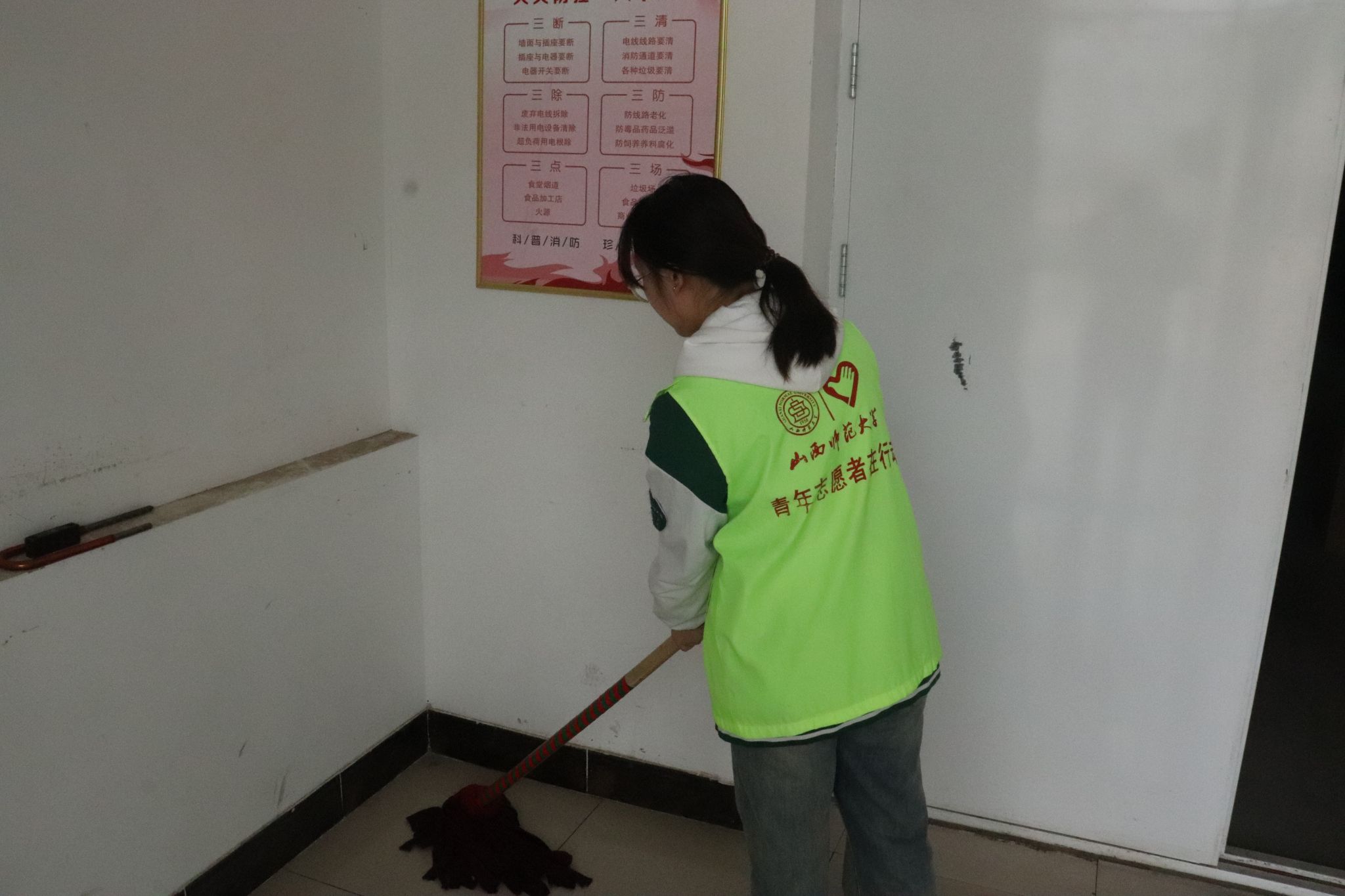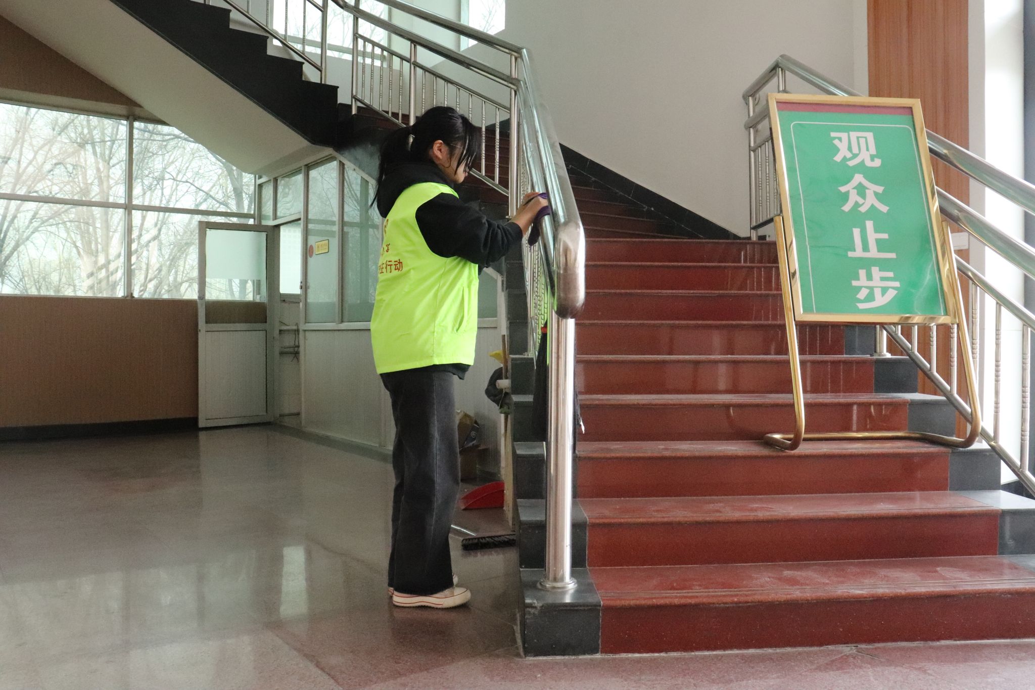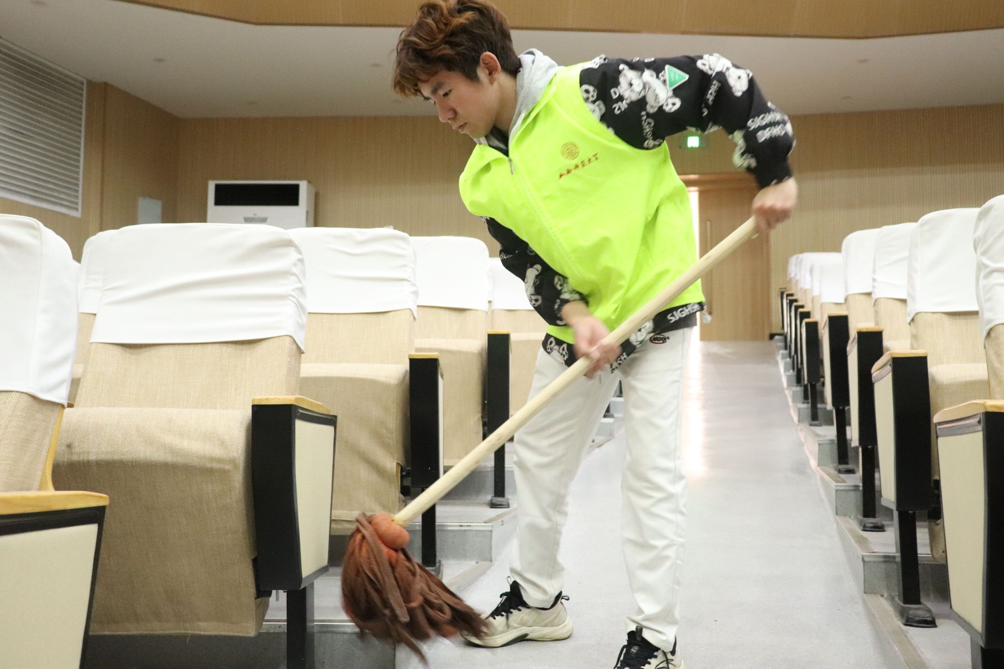 志愿者们按照老师的要求,分工协作,对艺术活动中心的各个地方进行全方面地清扫。志愿者们清扫地面、清理垃圾等,力求卫生环境不留死角,并将报告厅内的音响、桌椅、门窗擦拭整洁。在志愿者们的共同努力下,北区文化艺术中心被清扫得一尘不染。