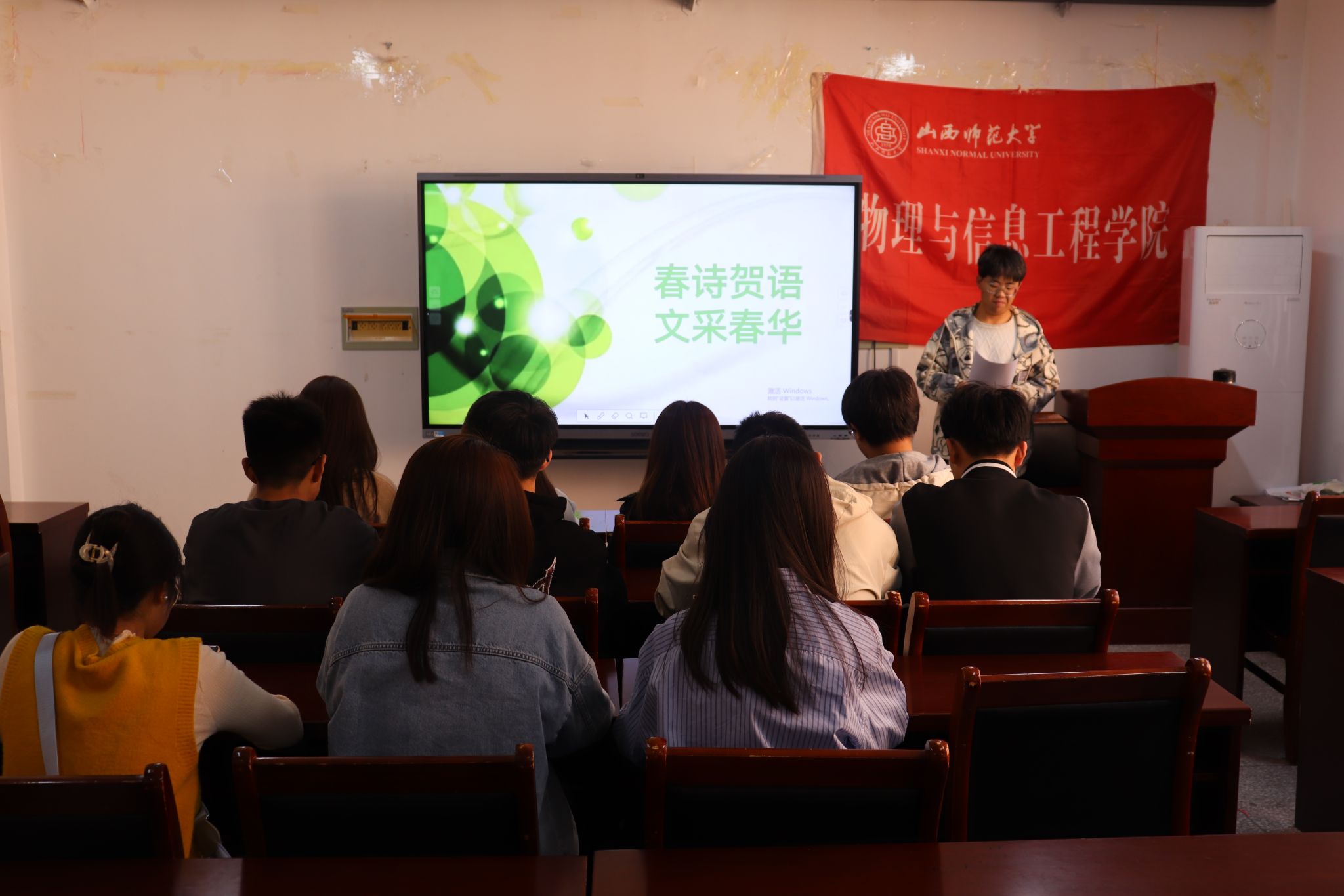为了丰富同学们的课余生活,抒发自己对春天的美好祝愿,院员工会办公室于3月30日下午15:00在南区实验楼S202以线上线下相结合的方式组织开展了“春诗贺语,文采春华”作品收集活动。本次活动由办公室志愿者牛梓琛主持。