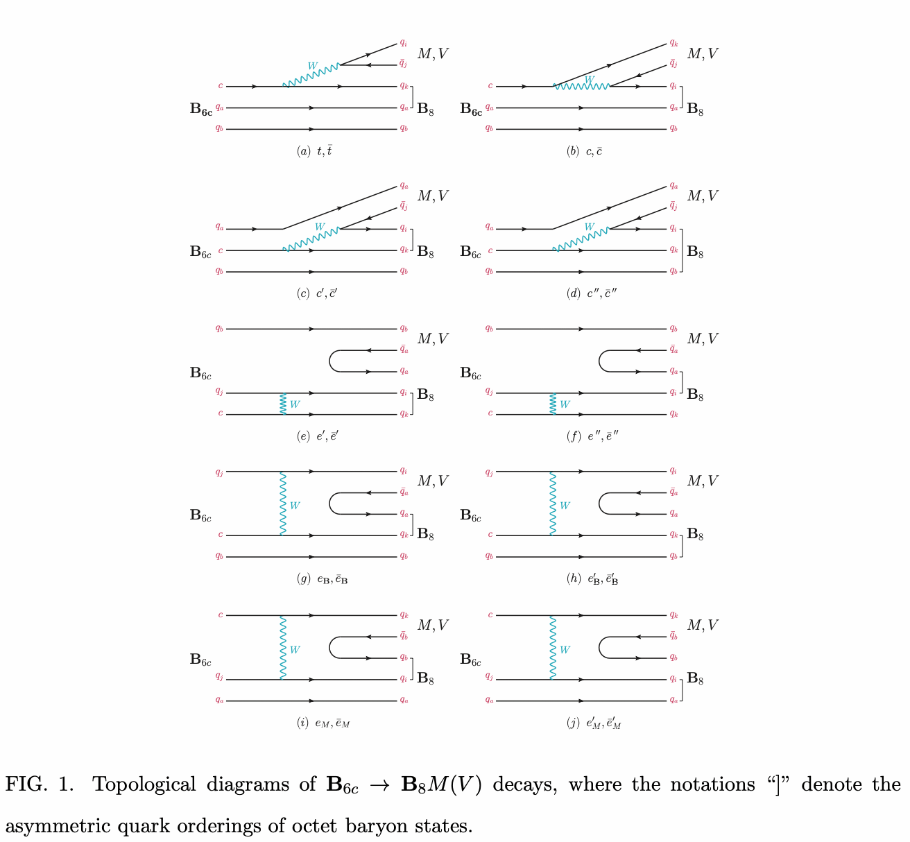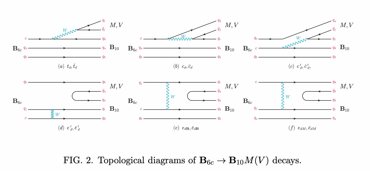 Omega-c 由css三个夸克组成,是六重态粲重子中唯一发生弱衰变过程的粒子。其两体非轻子弱衰变可通过多种拓扑构型实现,相关过程可用图一与图二所示的 W-玻色子发射与交换拓扑图加以表征。然而,这些拓扑构型对总衰变分支比的具体贡献目前仍缺乏系统了解。近年来,ALICE、Belle 和 LHCb 等国际大型实验合作组对 Omega-c衰变过程进行了系列重分析与新测量,为深入理解其衰变拓扑机制提供了重要契机。尽管已有七个相关的相对实验分支比被逐步测得,但对应的理论解释仍属空白。