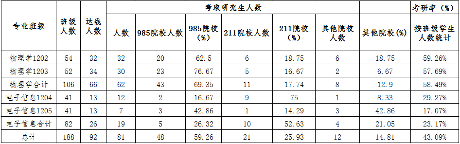 多年来,mobile28365的考研率一直保持在应届毕业生总人数的40%以上,而物理学专业的考研率则保持在60%左右。在公司2012级(除免费师范生外)188名同学中,有92人达线,81人被最终录取,总考研率为43.1%。其中物理学专业106名毕业生中,有62人考取研究生,考研率为58.5%;电子专业82名毕业生中,有19人考取研究生,考研率为23.2%。今年考取研究生的81人中,985院校48人、211院校21人,考取985、211院校的比例占到了考取总人数的85.2%。