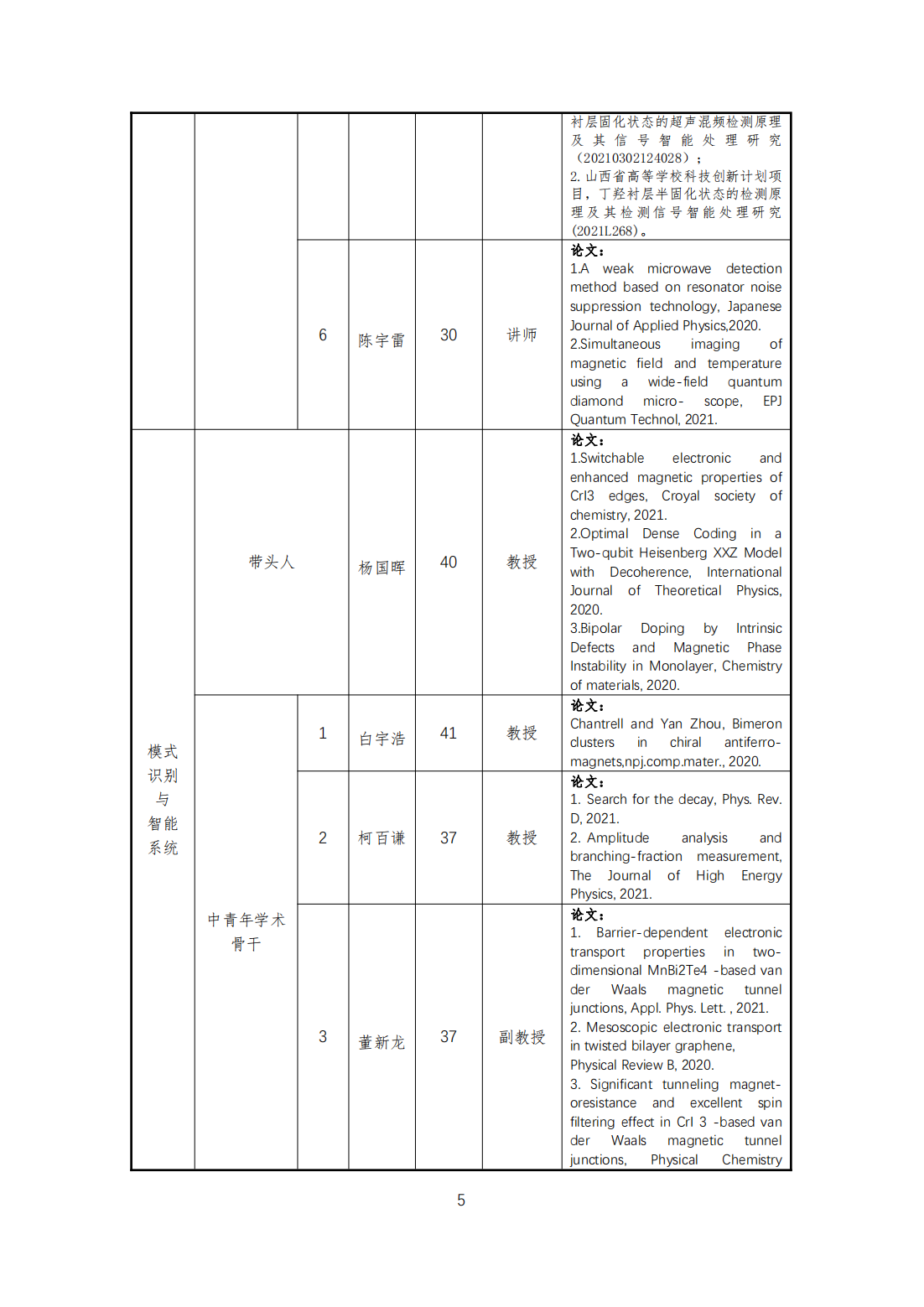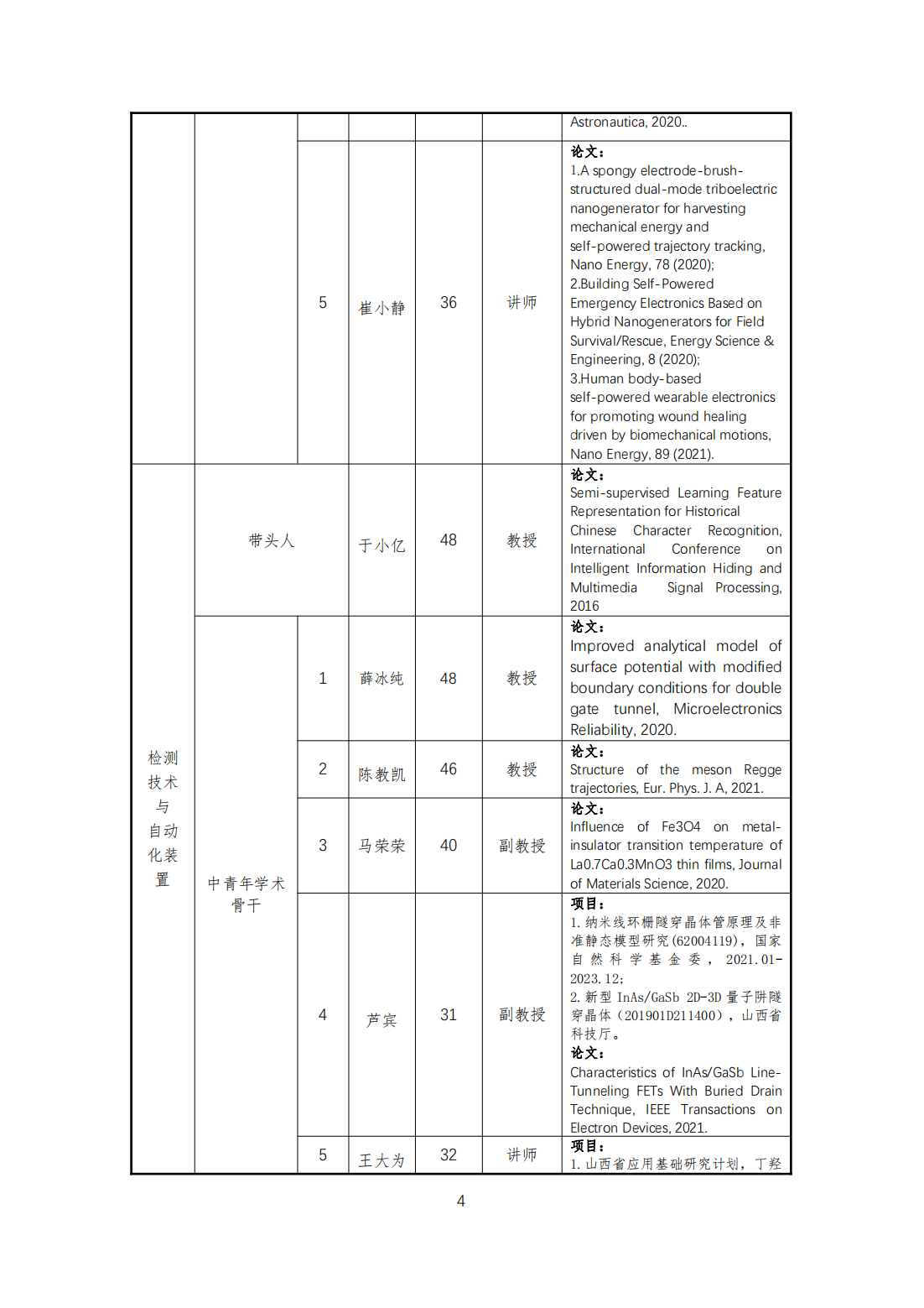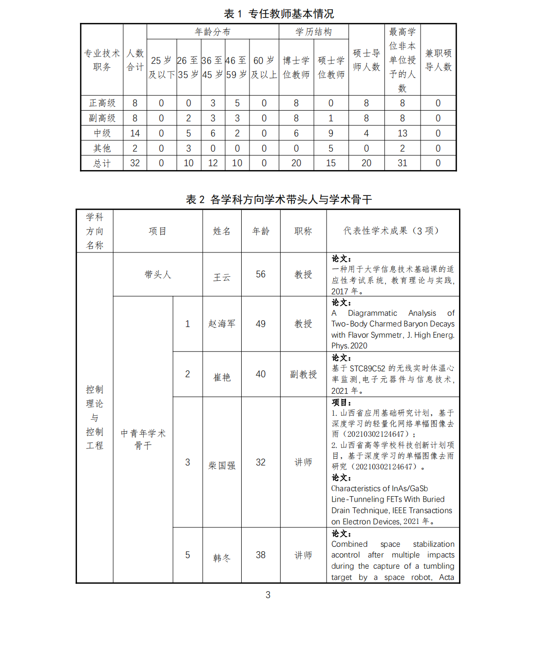 本学科团队队伍结构合理,整体素质较高,综合实力较强,本学科现有固定人员32人,其中教授8人,副教授8人;控制理论与控制工程学科方向10人,其余两个方向11人;具有博士学位20人,具有海外经历教师2人;山西省首批“三晋英才”2名;硕士生导师20人,占总人数的57.1%;45岁以下专任教师25人,占总人数的71.4%。专任教师队伍知识结构、专业技术职务结构、学历结构以及年龄结构合理,形成了以学术带头人为主、优秀中青年教师为骨干的教师梯队,充满发展活力与潜力。