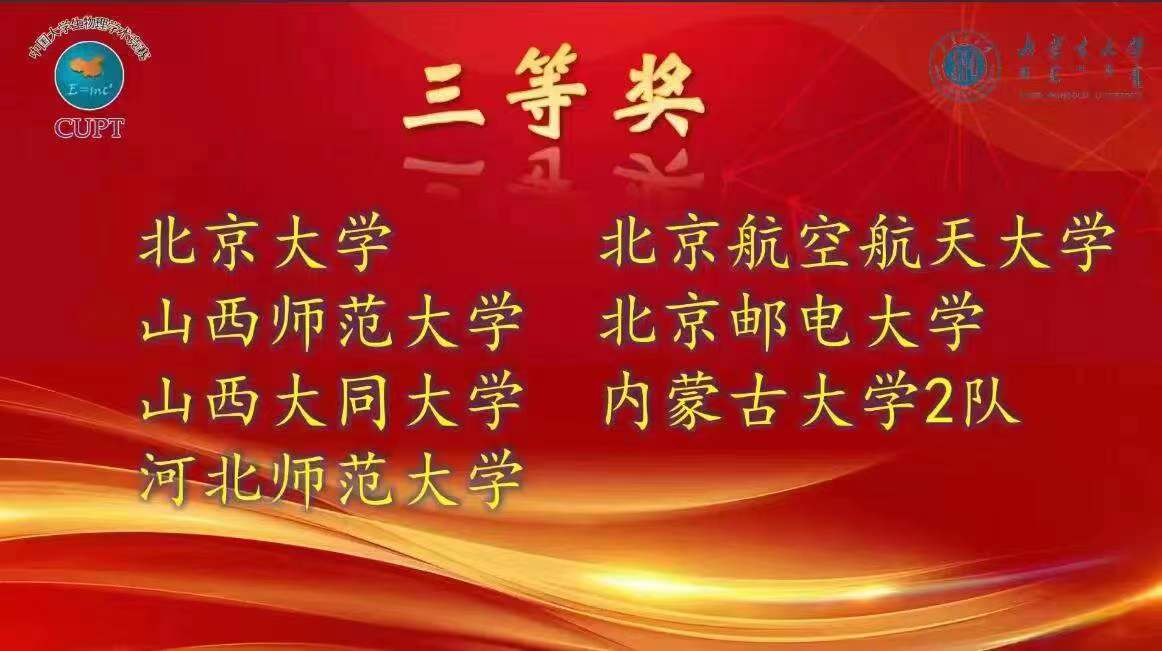 6月4日至5日,由中国老员工物理学术竞赛(CUPT)华北赛区组委会主办,内蒙古大学承办的2022年中国老员工物理学术竞赛(华北赛区)比赛在线上举行,共有来自北京、天津、河北、山西、内蒙古的13所参赛高校和15所观摩高校的近200名师生参加了本次赛事。公司参赛代表队由2020级的李丽娟、晁子怡、陈睿轩、冯昕和赵玲薇5名同学组成。经过2天紧张激烈的比赛,公司代表队最终获得2022年中国老员工物理学术竞赛(华北赛区)比赛团体三等奖。