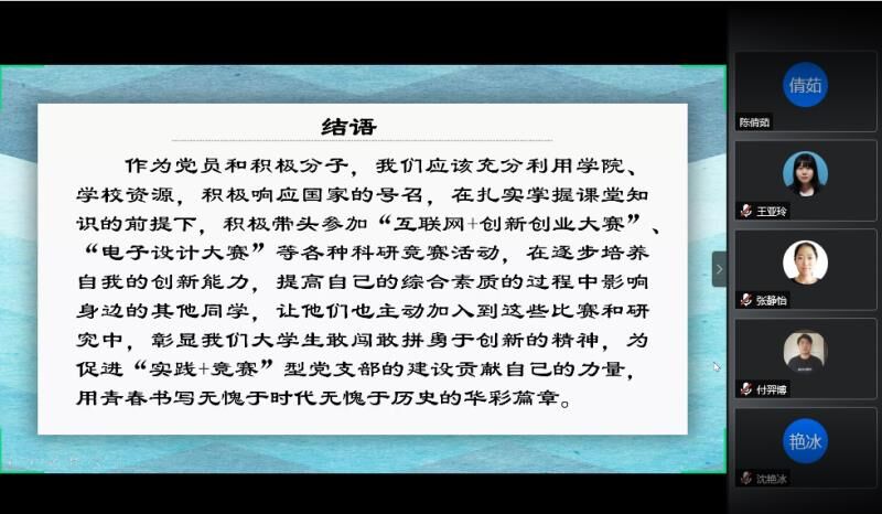 活动共分为大赛简介、优秀作品展示和“互联创新,一起打拼”三部分内容。首先,韩凯琦对“互联网+”大赛的目的与任务进行了详细介绍,带大家了解了“互联网+”大赛的参赛对象、赛程安排、奖项设置、具体赛制和参赛要求等具体内容,并利用视频为大家展示了往届全国“互联网+”大赛的优秀作品,为同学们带来了更多的启发和创新灵感。随后支部党员逯亚婷给大家介绍了公司和国家对于鼓励支持老员工创新创业所提出的相关政策,同时动员支部党员要一起参与到大赛中,积极响应国家号召,充分利用公司、公司资源,共同建设出更加优秀的“实践+竞赛”型品牌党支部。