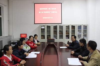 10月11日晚7:00,mobile28365第二教工党支部全体党员在四号楼一层会议室召开“四讲四有”第三次专题讨论会议。
