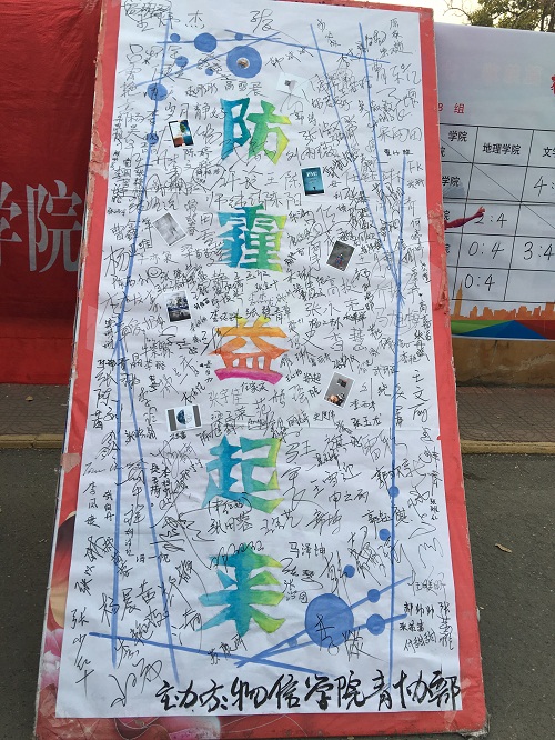 前期活动与11月10日在校医院门口开展。活动过程中,公司志愿者们首先通过播放视频和发放宣传单向同学们讲解了雾霾天气的产生原因、危害、生活防霾小贴士等相关知识,发放防霾宣传单,并耐心地解同学们有关雾霾预防的问题;活动通过邀请参与者在防霾条宣传展板上签名的形式,使更多的同学参与到防霾宣传活动中来,对防霾知识有了进一步的了解和学习。此外,公司志愿者们还免费为参与活动的同学发放贴有方面纪念标志的一次性口罩,呼吁大家在学习生活之中将灰尘“拒之门口”,活动以其新颖的形式和志愿者们热心的讲解吸引了全校众多师生参与其中。