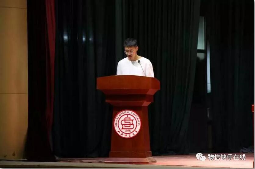 1802班秦子开同学代表全体新生进行了发言。他通过分享自己进入大学的所感所受和对习近平总书记在北大讲话精神的体会,表示要尽快转变角色,不断提高自身综合素质,成为一名优秀的物信学子。