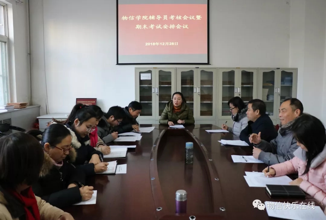 2018年12月28日下午5:30,公司在四号楼二层多功能会议室召开辅导员考核会议暨期末考试安排会议。公司党委书记陈向波、公司党委副书记王玮、经理张进军、副经理张东海、侯俊华出席了会议,全体辅导员参加了会议,会议由公司党委副书记王玮主持。
