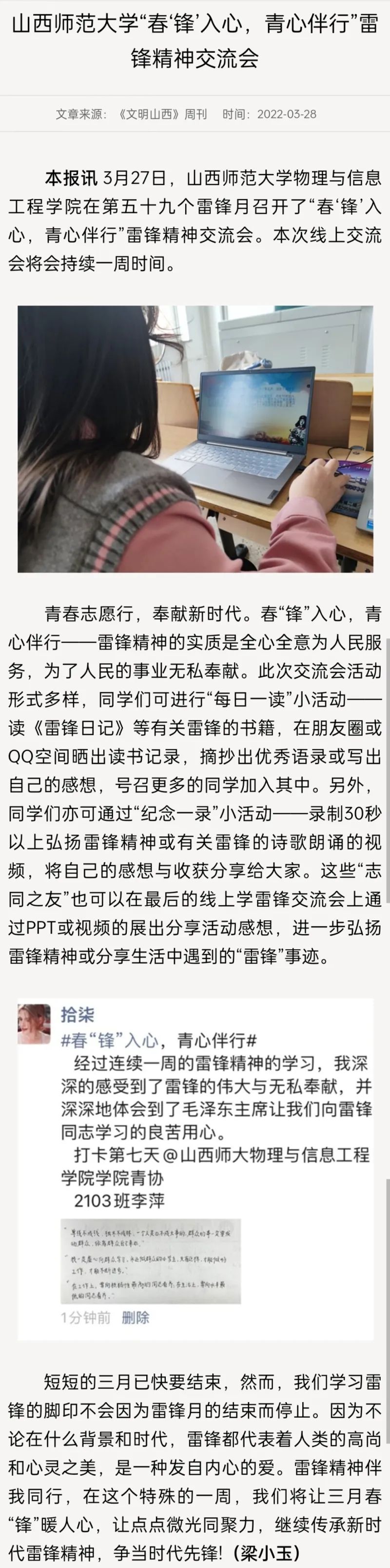 3月28日,文明山西网以“mobile28365正规网址‘春锋入心,青心伴行’雷锋精神交流会”为题,报道公司学子在第五十九个雷锋月参加了持续一周的雷锋精神交流会。