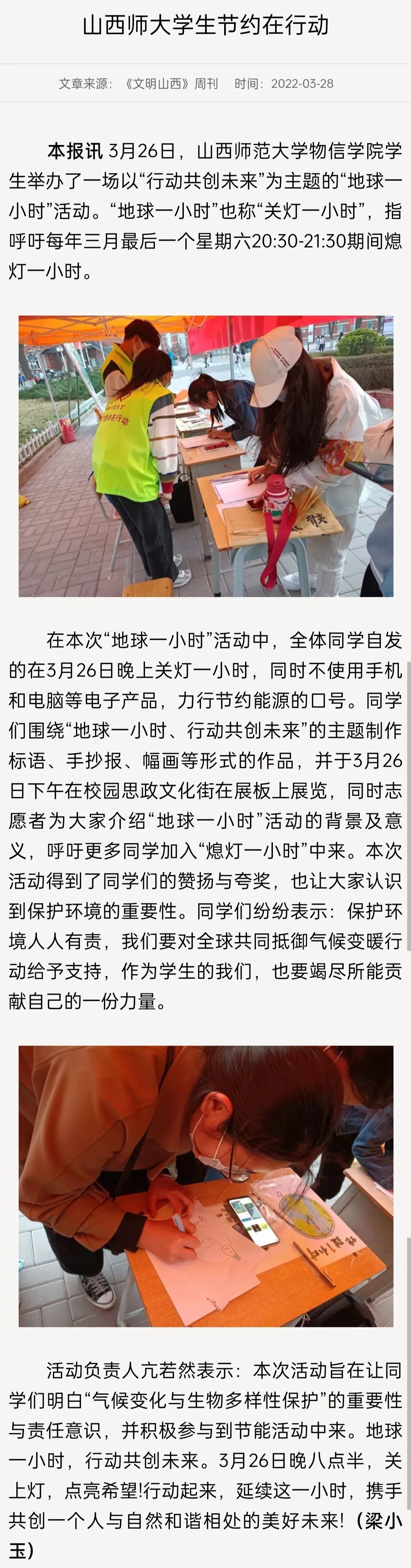3月28日,文明山西网、黄河新闻网分别以“行动共创未来”、“山西师大学子倡导开展‘地球一小时’宣传活动”为题,报道了公司举办的“地球一小时”活动。活动中,员工在宿舍熄灯一小时,同时不使用手机等电子产品,力行保护资源,保护地球,并以“地球一小时,行动共创未来”为主题,制作标语、手抄报、幅画等作品,呼吁大家一起参与活动,节约资源,保护我们美好的家园。媒体报道是对公司开展“地球一小时”活动的肯定,对员工保护环境行为的赞扬,鼓励大家行动起来,从身边小事做起,节约资源、保护环境,携手共创人与自然和谐相处的美好未来。