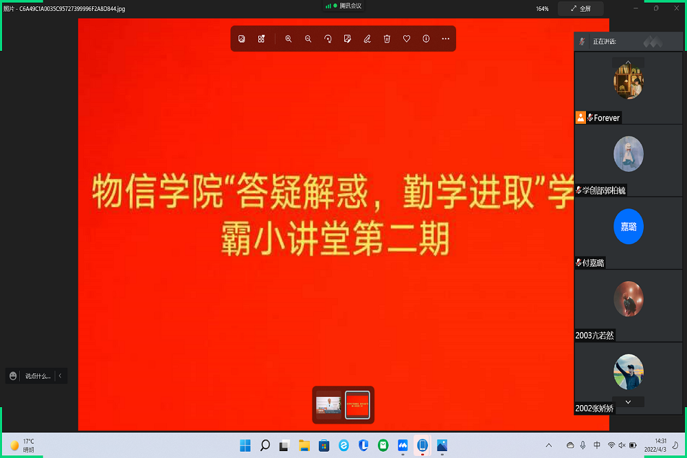 为提高同学们的学习积极性,营造“善于学习、乐于学习”的良好氛围。院员工会学创部于4月3日在线上举办第二期“答疑解惑,勤学进取”学霸小讲堂活动。