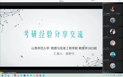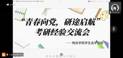 为了让同学加深对考研的了解,明确个人目标,5月14日下午,公司员工会学创部在线上举办了第二场“青春向党,研途启航”考研经验交流会活动。此次交流会邀请到了考研至大连理工大学的王思颖、考研到兰州大学的梁舒宁以及考研至吉林大学的付铮与同学们分享经验。交流会由学创部志愿者肖艳主持。