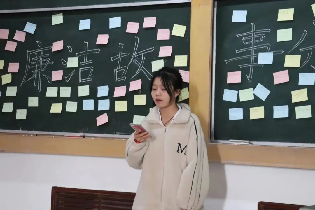 活动中,在主持人的引导下,同学们在便利贴上写下有关廉洁的名言警句,并将其贴到黑板上。每位同学都分享了自己准备的小故事,他们以个人或团体的形式,用周恩来、孔子、海瑞等人物事迹,回忆并宣扬了廉洁的精神。在热烈的氛围中,大家被历史人物廉洁的精神所感染,纷纷表示要通过自己的实际行动来培养正确、积极、健康的道德观念、法制意识和责任意识。