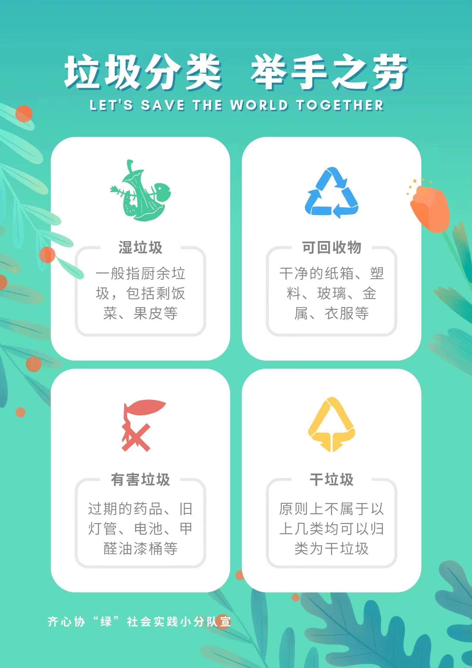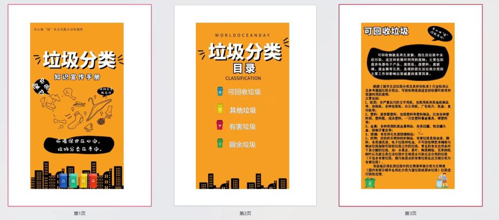 实践过程中,实践队员分工合作,通过自己制作的宣传海报引导居民养成垃圾分类意识,学会辨别垃圾种类,宣扬垃圾分类意义。此外,队员还通过向群众派发宣传手册,向居民科普可回收垃圾、其他垃圾、有害垃圾和厨余垃圾的定义、投放要求以及随意乱扔带来的危害。