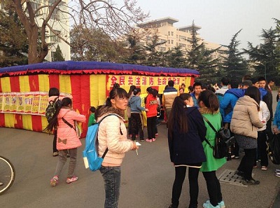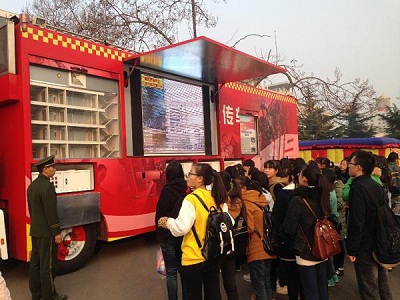 讲座结束后,在巨人广场,由临汾市公关消防支队的官兵为我们进行模拟实战演练。在演练过程中,消防官兵们为我们模拟了烟雾传播的方向,还为我们提供了119报警体验和消防知识趣味测试等,更为我们提供了模拟逃生帐篷,使我们亲身体验了火灾逃生。