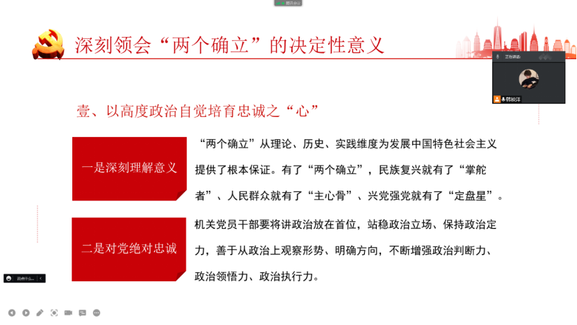 活动中,支部成员岳琳坤结合PPT为同学们讲述了“两个确立”的重要意义,以及二十大召开的历史意义。韩皎洋强调,同学们要肩负起青年的责任与担当,树立正确的理想、努力成长为堪当民族复兴大任的时代新人。讨论交流环节,同学们纷纷表示,中国共产党带领中国人民栉风沐雨,砥砺前行,作为新时代青年,一定要深入学习党的历史,不断巩固学习成果,刻苦努力,砥砺奋进,以优异的成绩迎接党的二十大胜利召开。(文/2104班 金启欣 摄/2104班 徐欣韵)