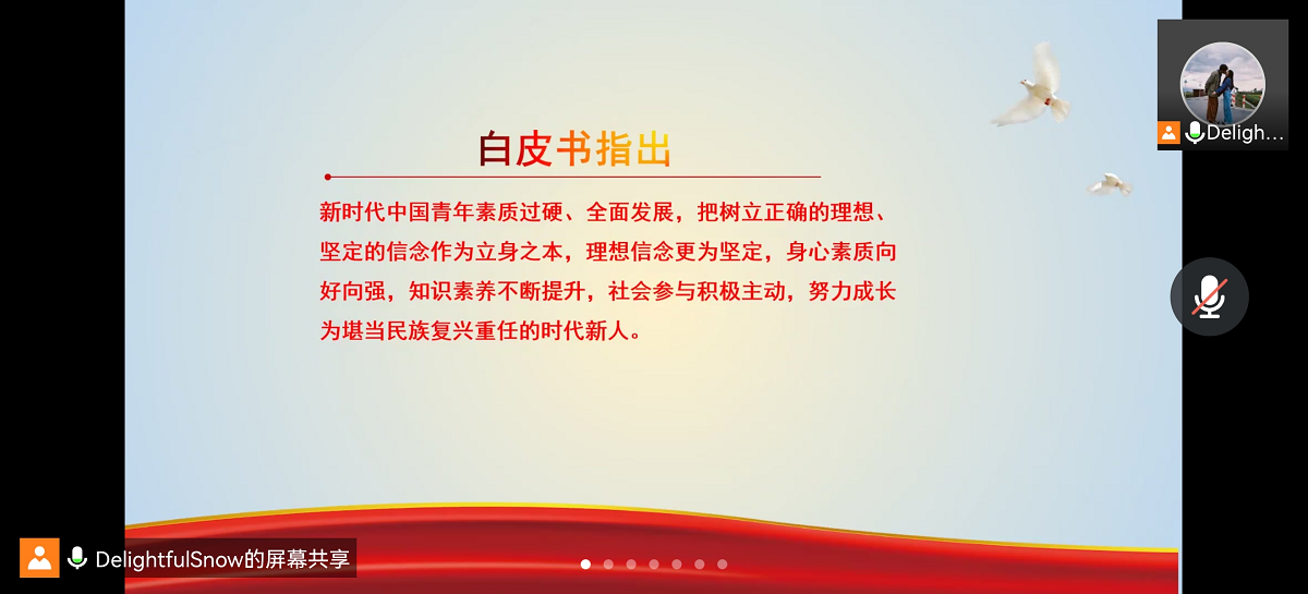 活动中,张寒雪带领同学们学习了《新时代的中国青年》白皮书(以下简称白皮书)正文的四个章节。她强调到,这是我国首次专门就青年群体发布的白皮书,是一部记录新时代中国青年发展事业成果、反映新时代中国青年精神风貌的重要文献,同学们要认真学习,领会其中的深刻含义。讨论交流环节,同学们就自己对白皮书的学习发表感悟,大家纷纷表示,自己将会坚决“听党话,跟党走”,树立正确的理想、坚定的伟大信念、担当时代重任,为国家建设奉献自我。(文/2005班 范雨萱 摄/2005班 范雨萱)