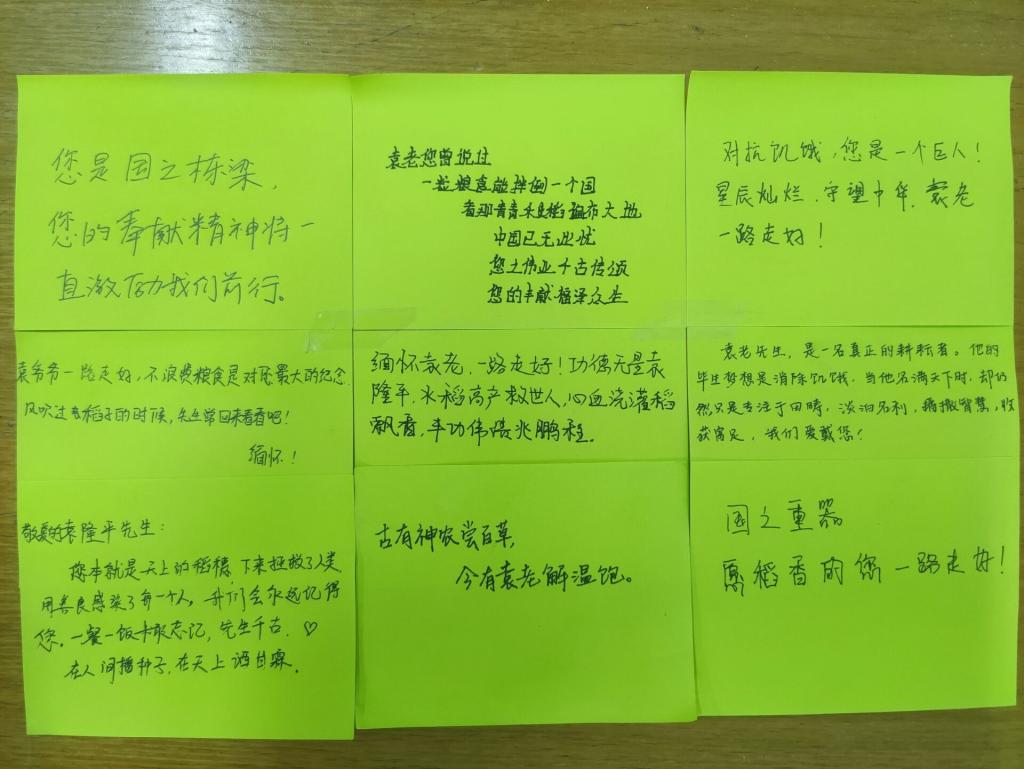 活动中,冀宇琴组织同学们观看了袁老的事迹短片,回顾了袁隆平院士一生所做出的伟大贡献,重温了袁老说过的那些动人的话语,领悟了“杂交水稻之父”身上闪闪发光的品质与精神。随后,同学们围绕袁隆平精神展开了讨论。同学们纷纷表示禾下乘凉梦,一梦逐一生,这是袁隆平的梦,也是每一位中国人的梦,作为青年员工要努力学习袁老以祖国和人民需要为己任,敢于创新、艰苦奋斗的崇高精神。活动结束后,同学们自发写下了对袁老的无限哀思。(文/1902班 徐瑾华 摄/1902班 赵君海)