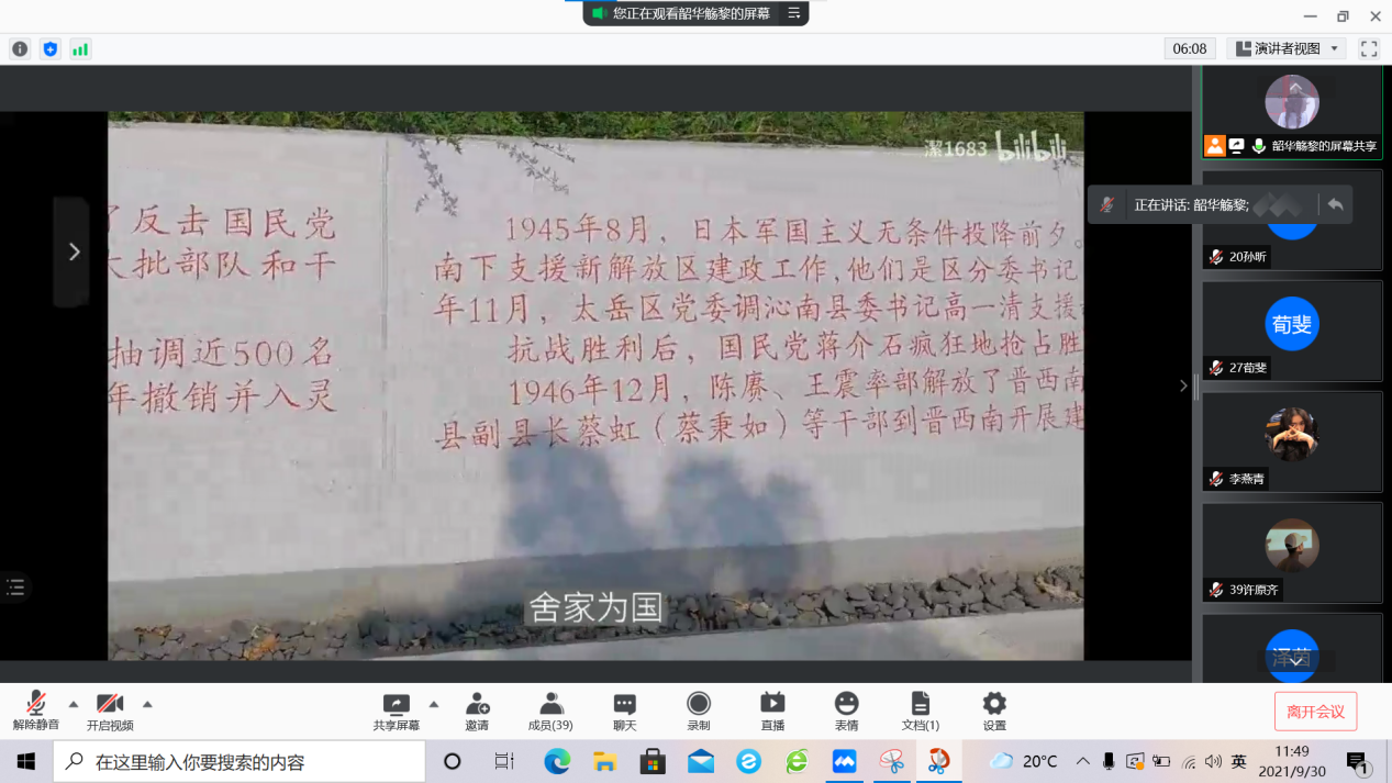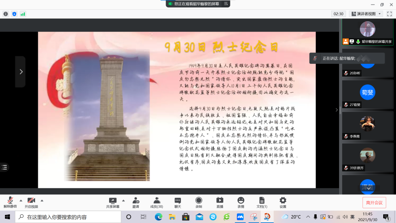为纪念我国第八个烈士纪念日,激发同学们的爱国热情,公司2001班团支部于9月30日上午线上举办了“祭英烈,颂国情,强国志”主题团日活动。此次活动由团支书李星萍主持。