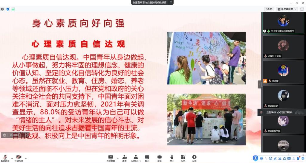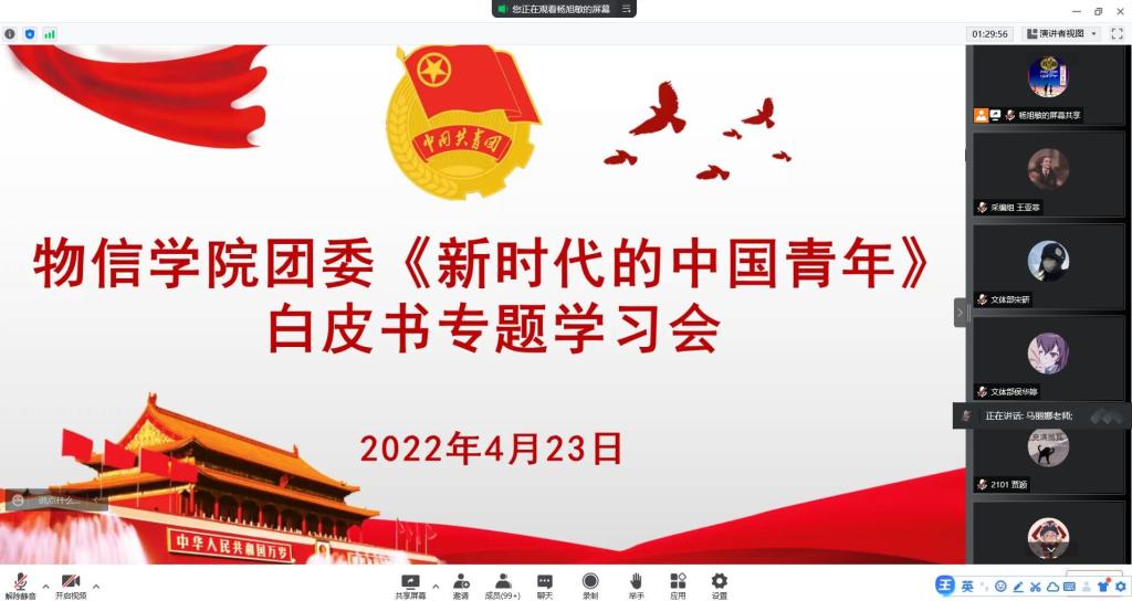 为引导公司同学树立正确的理想,发扬新时代中国青年的优秀品质,4月23日,院团委于线上开展了《新时代的中国青年》白皮书(以下简称白皮书)专题学习会。院团委副书记马丽娜出席会议,团学组织成员以及各班班长、团支书参加本次学习会。会议由院团委(员工)副书记张婧榕主持。