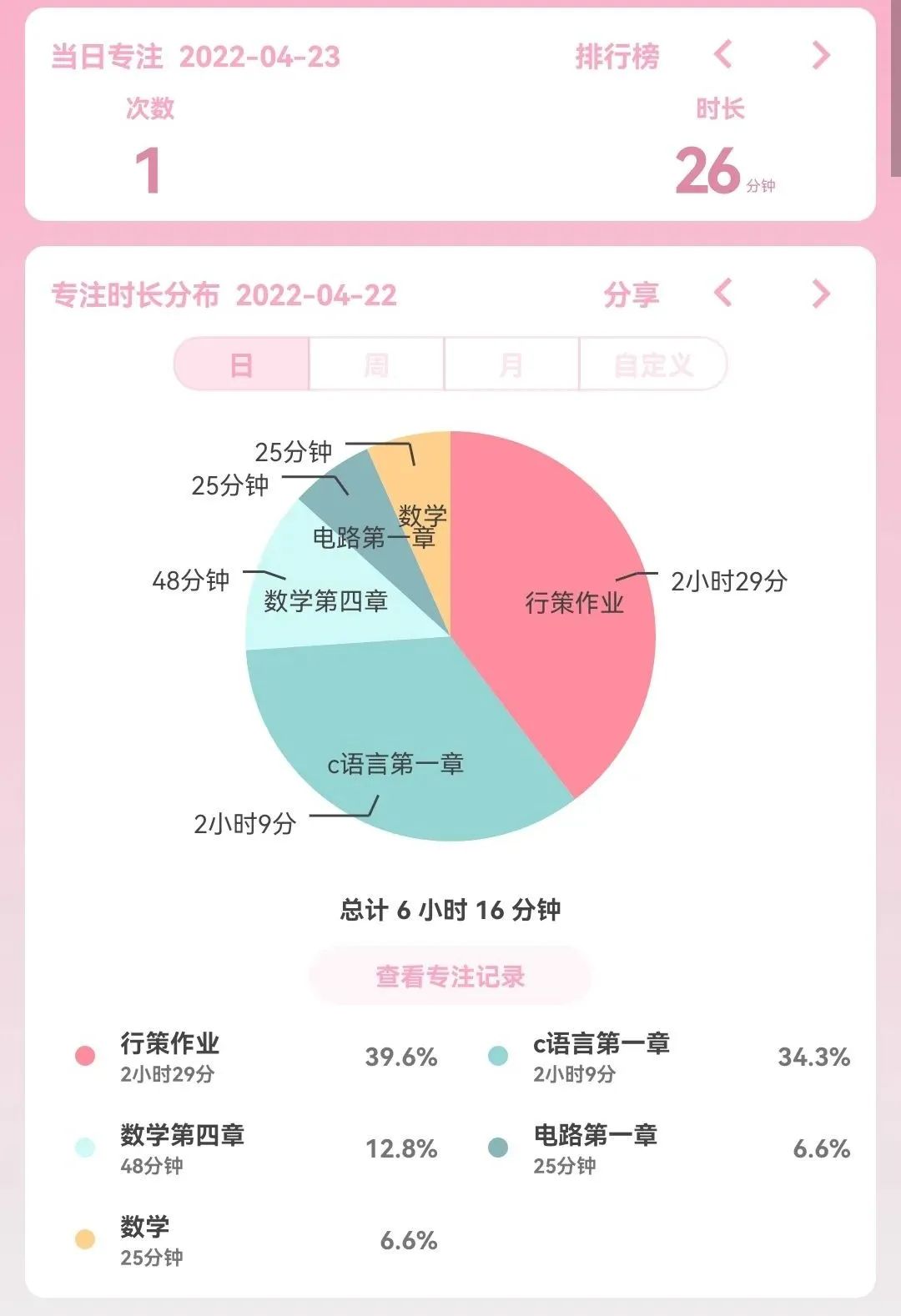 活动中,参加活动的同学们利用时间管理软件“番茄to do”记录学习情况,并将每日软件统计数据页面上传至腾讯文档小程序进行打卡,经过统计,活动期间学习共计时间最长者高达1080分钟。按时打卡、规律生活让同学们受益匪浅,参与活动的同学们纷纷表示,要在以后的学习生活中,继续延续这种习惯,坚持按时学习。