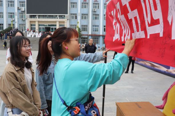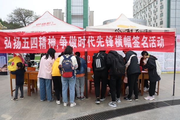 活动前期,志愿者们准备了大量关于五四运动、五四精神的知识竞答题目,在活动现场,志愿者们邀请来自各个公司的员工参与知识竞答,以寓教于乐的方式引导大家对五四运动有了更多的关注和认识。在写有活动主题“弘扬五四精神,争做时代先锋”的条幅上,大家纷纷签名,表达了同学们秉持不忘初心、牢记使命的信念,争做新时代的开拓者和建设者的决心。(文/2001班 程钰祺 摄/2004班 宁紫轩)