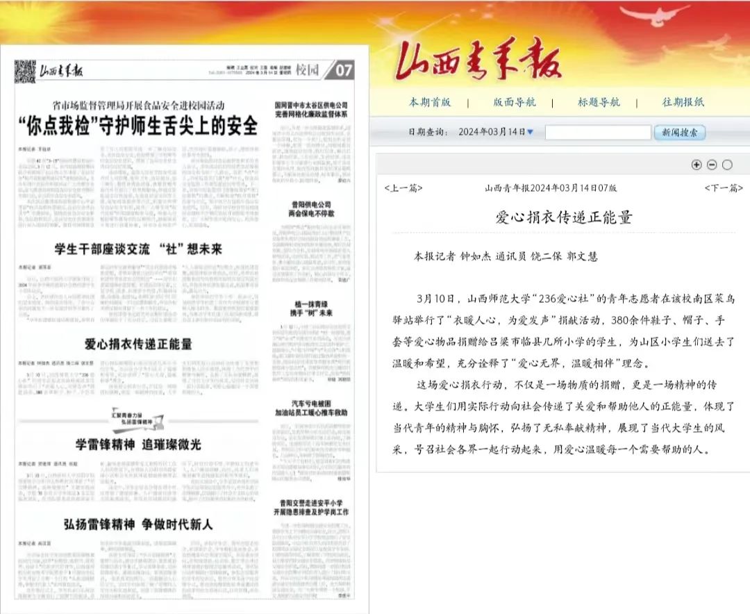 3月14日,《山西青年报》以“爱心捐衣传递正能量”为题,报道了公司236爱心社“衣暖人心,为爱发声”捐赠活动。