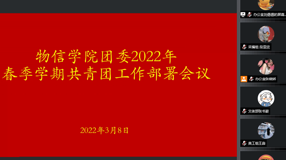 3月8日晚,院团委于线上召开了2022年春季学期共青团工作部署会议。各部门负责人以及志愿者参加了此次会议。会议由院团委负责人马丽娜主持。