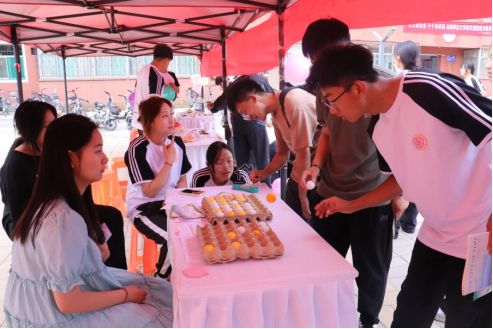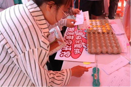 其次是乒乓球五子棋,大家不仅要将球一个一个投进去,还要动脑筋思考棋局,以最优的策略率先完成五子连棋,为烦恼的释放打通七经八络。乒乓球在空中划出一道道优美弧线的同时,同学们也在冷静思考、精心布局。每当一颗颗棋子落下,都会引发围观者的阵阵惊叹。