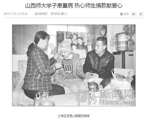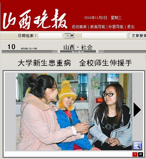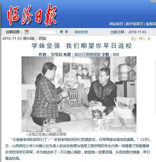 爱心活动也得到了社会媒体广泛关注和好评,11月2日《山西晚报》以《大学新生患重病,全校师生伸援手》为题在10版、11月3日《临汾晚报》以《学妹坚强,我们期望你早日返校》为题在第4版先后进行了图片文字报道。