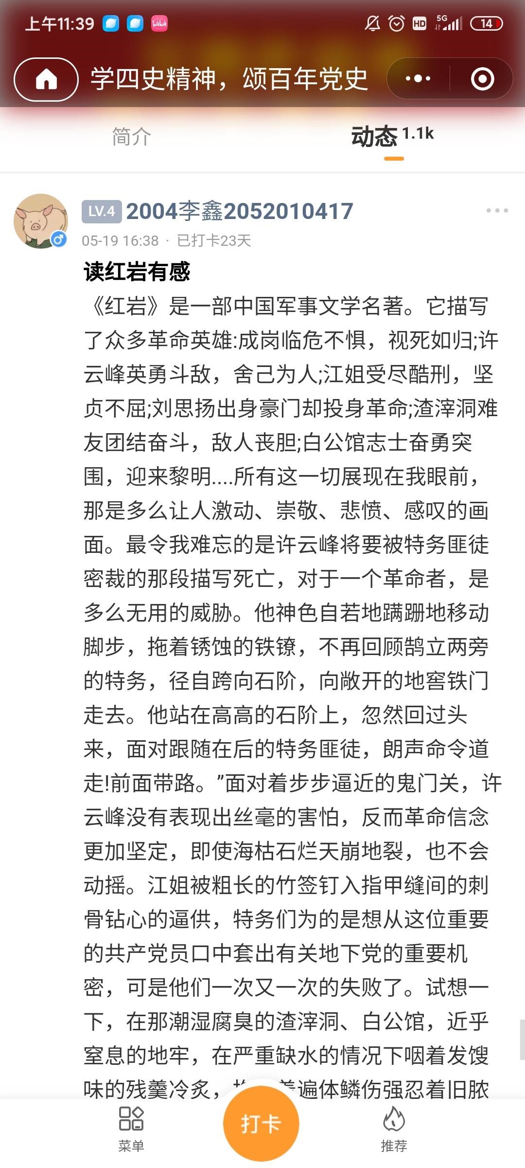 此次读书打卡活动切实提高了党史学习的吸引力和针对性,让同学们进一步了解了中国共产党的光辉历程和光荣使命,激励同学们知史爱党、知史爱国。(文/2003班 张馨文)