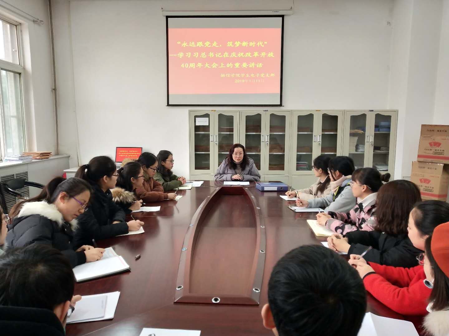 2019年1月11日中午11:20,公司党委副书记王玮为公司员工电子党支部在四号楼一层会议室作了“‘永远跟党走,筑梦新时代’——学习习近平总书记在改革开放四十周年大会上的重要讲话”主题党课。全体在公司党员共计27人聆听了此次党课。