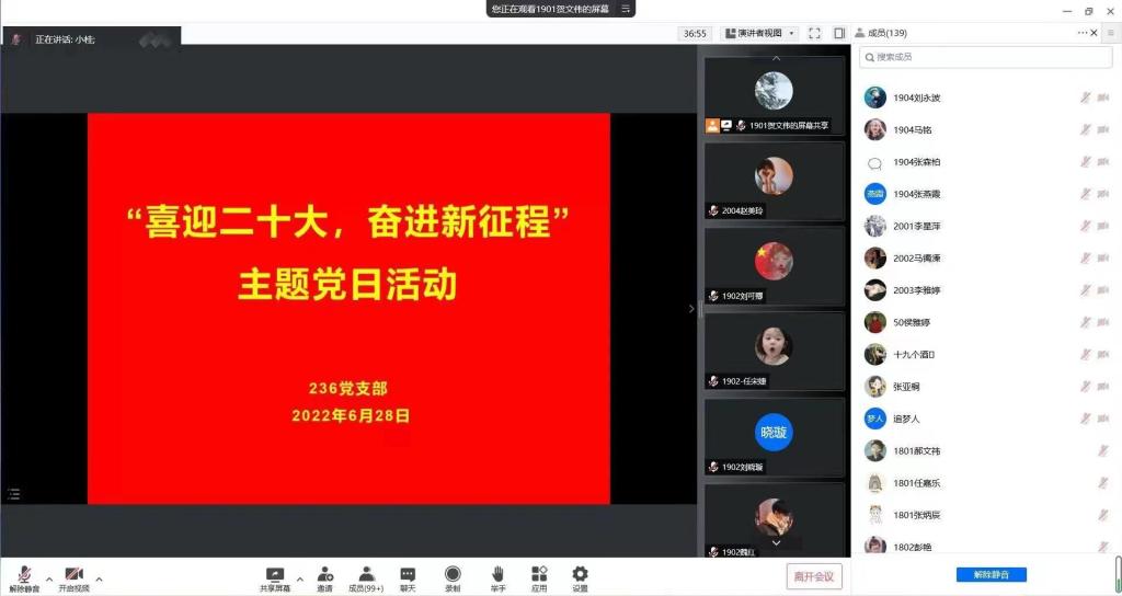 6月28日,公司236党支部在腾讯会议开展了“喜迎二十大,奋进新征程”主题党日活动。支部全体党员参加了此次活动,本次活动由支部书记郭桂春主持。
