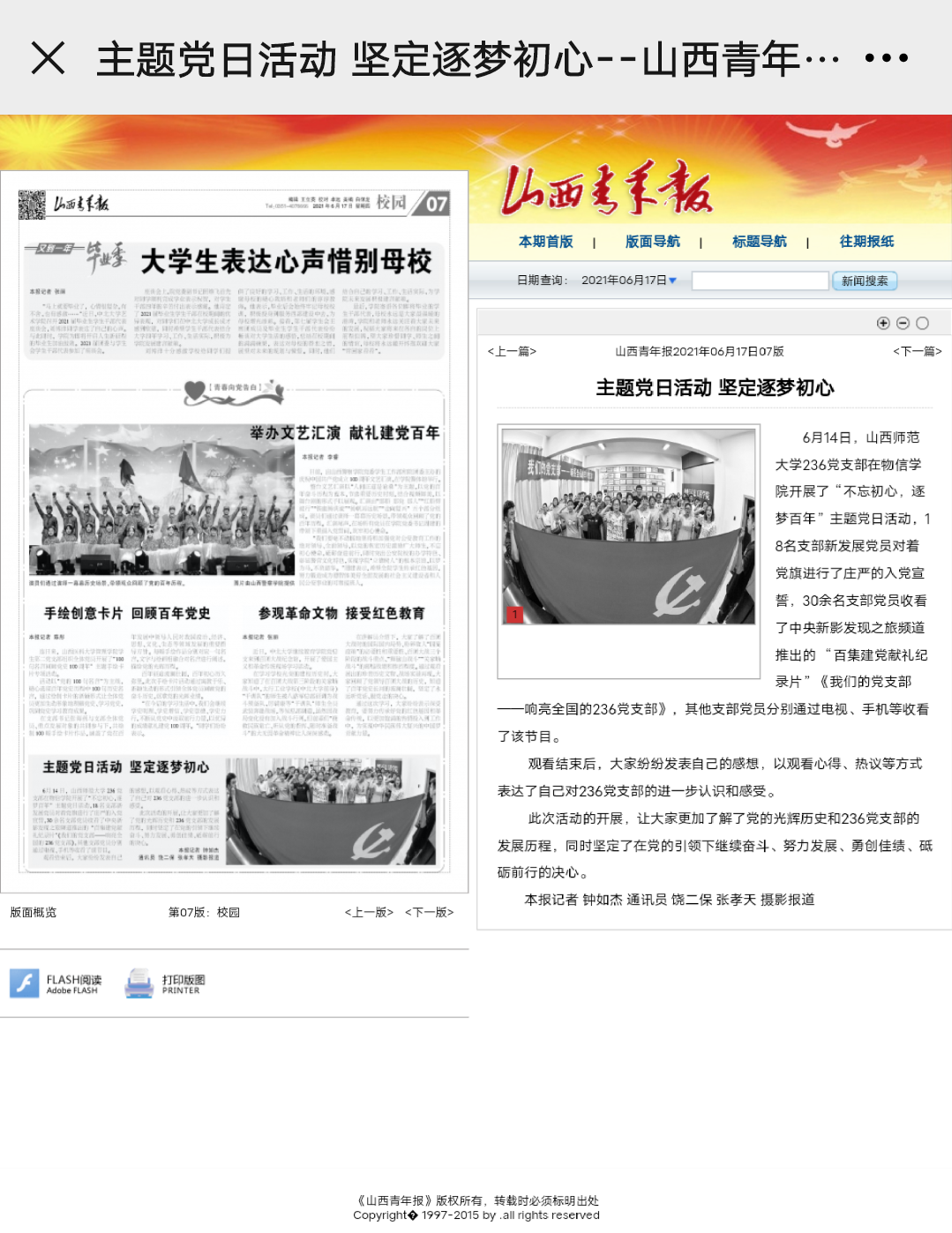 6月17日,《山西青年报》以“主题党日活动 坚定逐梦初心”为题报道了公司236党支部开展“不忘初心,逐梦百年”主题党日活动。