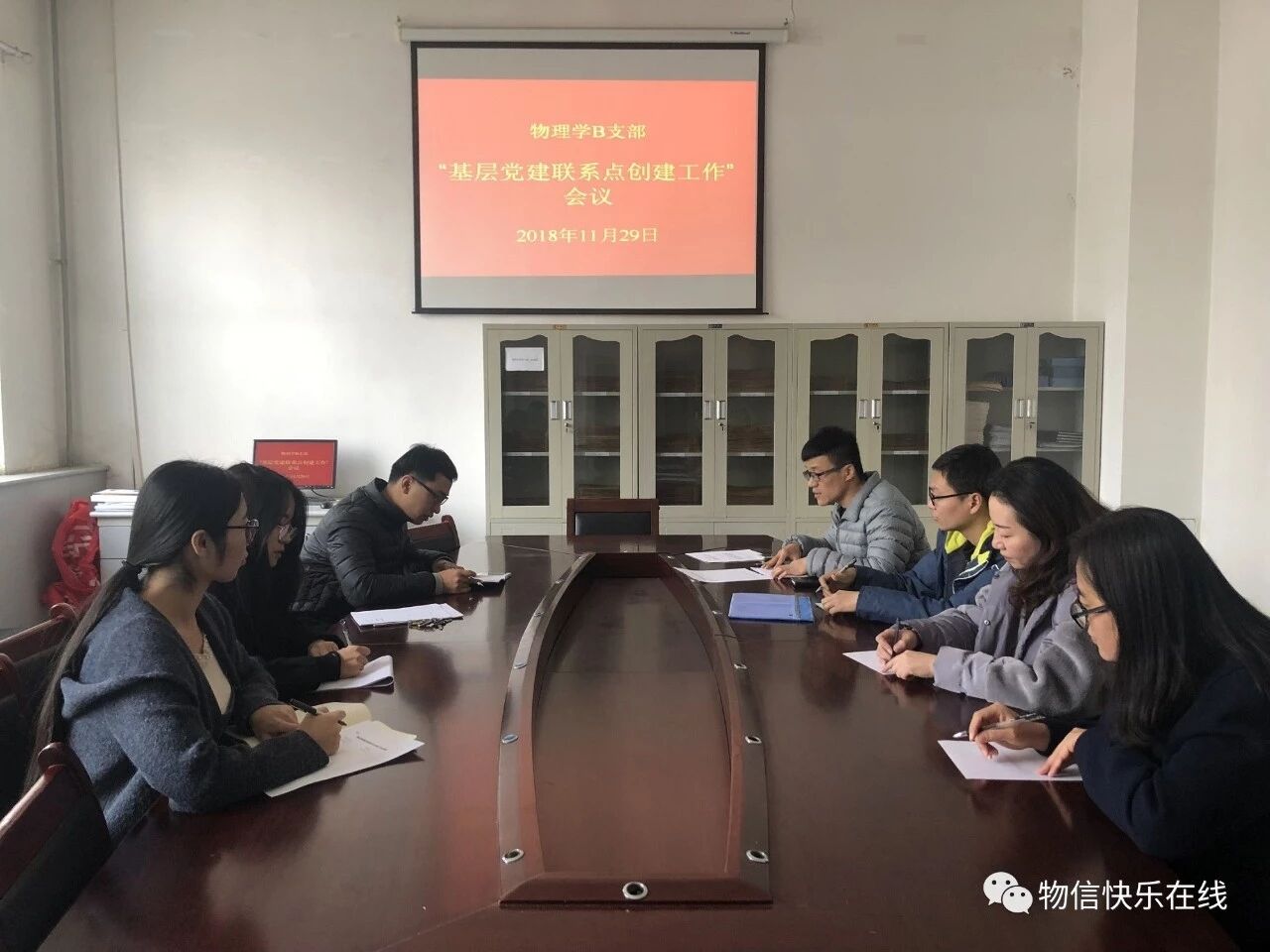 2018年11月29日,公司物理学B支部在四号楼一层会议室召开“基层党建联系点创建工作”会议。支部全体党员参加了会议,会议由支部书记徐小虎主持,支部联系人公司党委副书记王玮参加了会议。