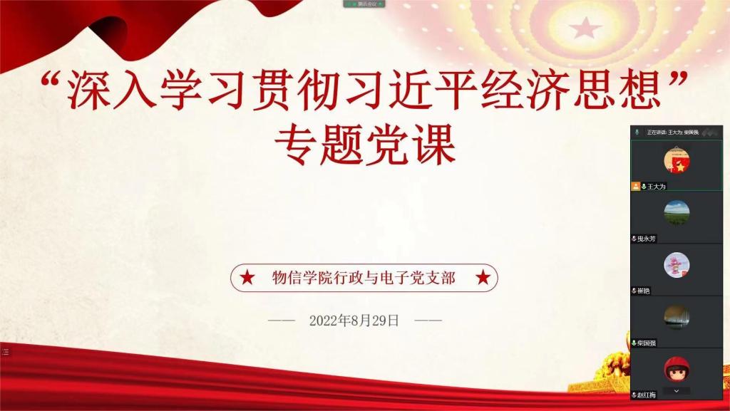 8月29日上午10:00,公司行政与电子党支部在腾讯会议开展了“深入学习贯彻习近平经济思想”专题党课。本次党课由支部书记王大为讲授,支部全体党员参加了活动。