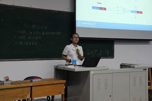 三名大四员工皆从说课和模拟授课两个方面来开始自己的展示。首先,苏慧学姐用简洁明了的语言,清楚地阐释了物理学著名定律“楞次定律”;接着,李倩学姐分别通过演示法、讲授法和实验法为大家解释了“通电导线在磁场中受的力”;随后王强学长巧把难懂的问题简单化、生动化,用自制的教学图片和视频讲述了物理学上较难懂的“涡流、电磁阻尼和电磁驱动”。最后,学长学姐们和大一新生进行深切的交流,并耐心地解答他们提出的各种问题。