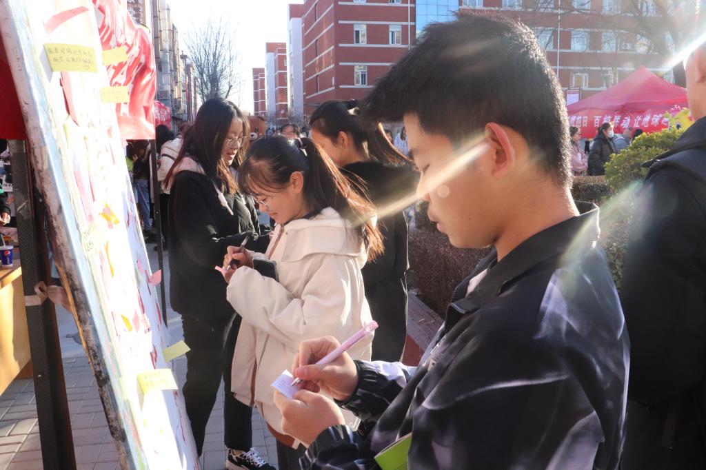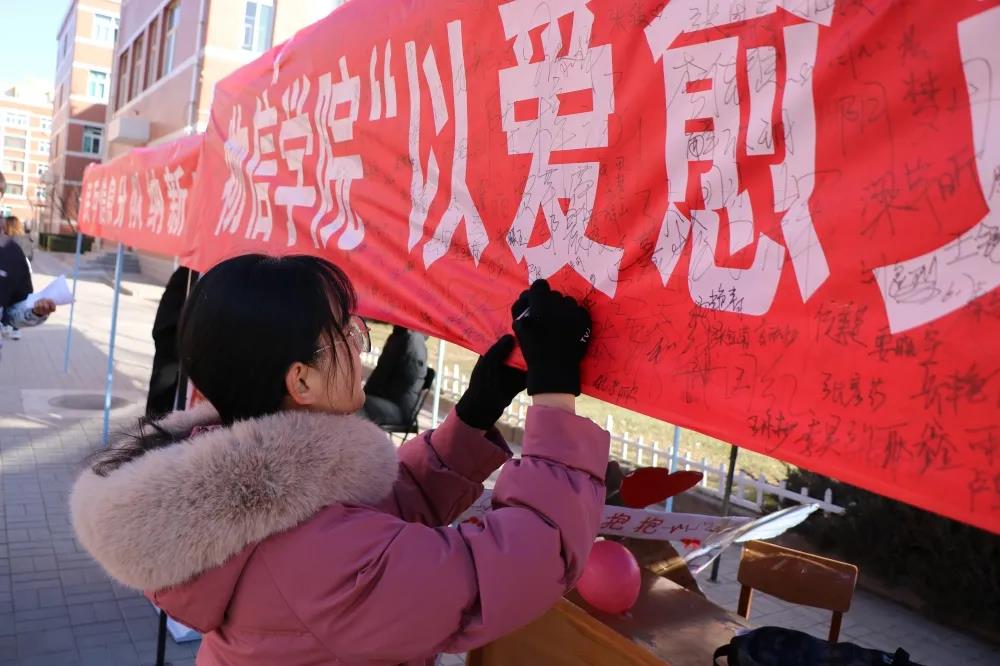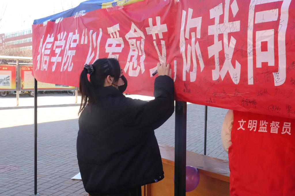 本次活动吸引了众多同学积极参与,寒风中大家一手拿着笔,一手抵着横幅,认真签下自己的名字,并在便利贴上写下自己的美好祝福和期待粘贴在海报上,对艾滋病患者表达最诚挚的祝愿。参与活动的同学们还领取了写有关于预防艾滋病知识的小卡片以及手工制作的象征着艾滋病国际符号的红丝带。