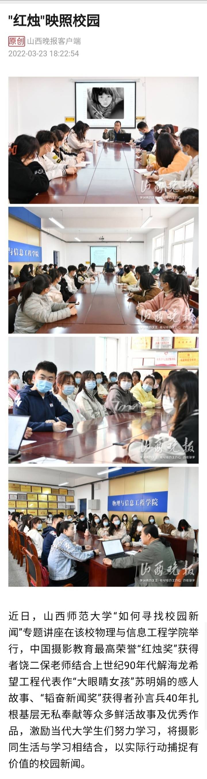 3月23日,山西晚报客户端以“‘红烛’映照校园”为题,报道了饶二保老师为公司老员工新媒体工作中心开展的“如何寻找校园新闻”专题讲座。
