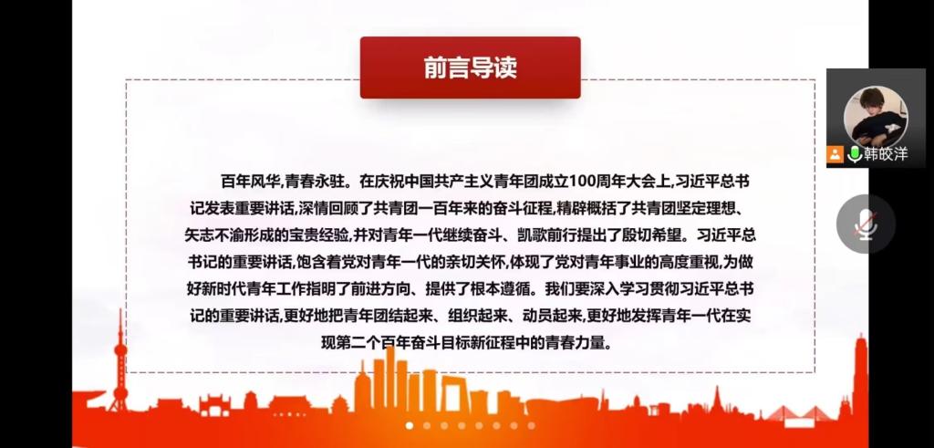 活动中,各班团支书带领同学们学习了习近平总书记在庆祝中国共产主义青年团成立100周年大会上的重要讲话,回顾了中国共产主义青年团自诞生到现在的百年历史。1906班团支书王娜强调:作为一名团员,我们要紧密地团结在以习近平同志为核心的党中央周围,始终牢记、忠实践行习近平总书记对共青团和青年工作的期望与要求,并明确自己所肩负的社会责任。同学们纷纷表示,作为当代青年,应当谨记习近平总书记的教诲,牢固树立共产主义远大理想,自觉担当责任,在我们这一代的新长征路上贡献出自己的青春力量。