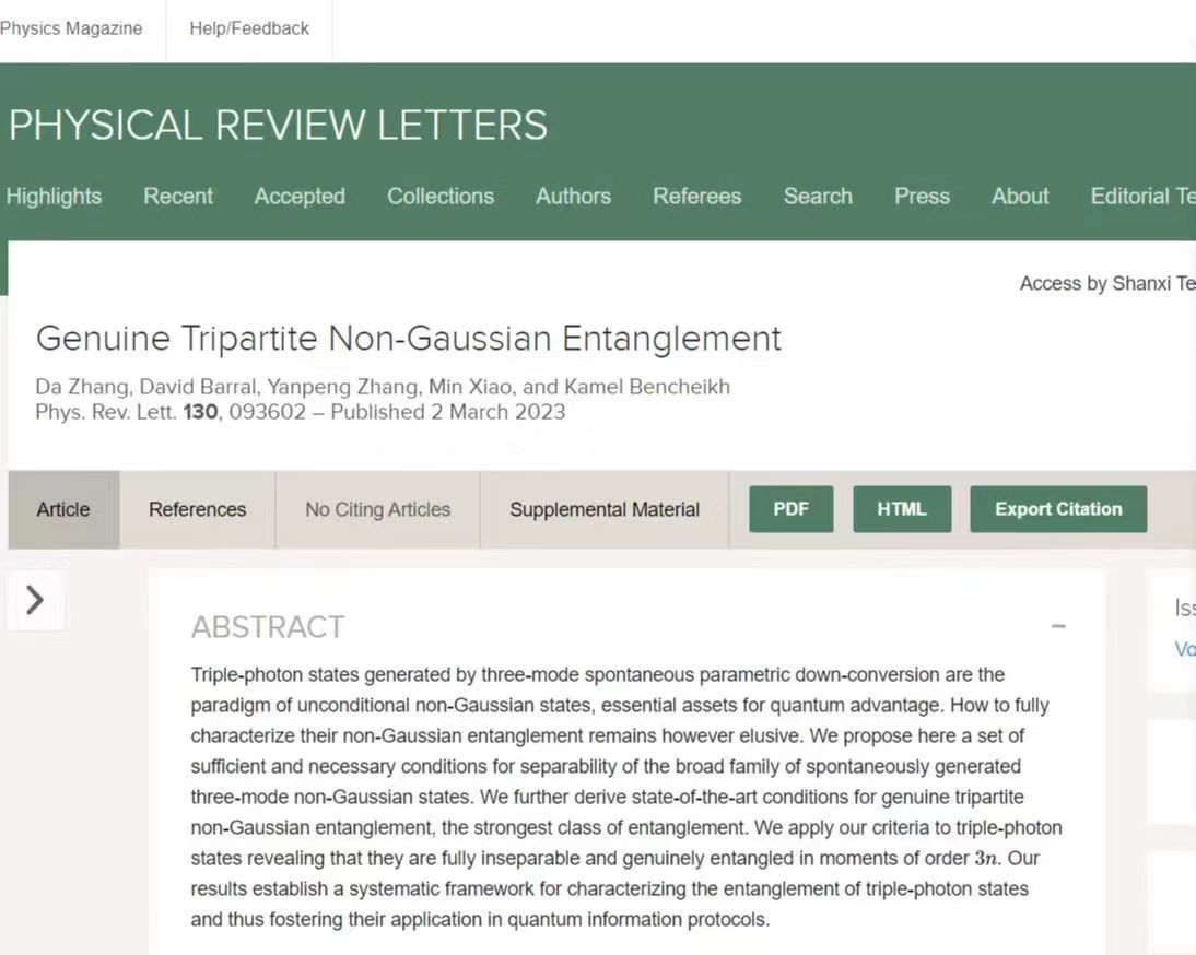 近日,公司张达老师与法国索邦大学卡司特勒—布洛索实验室博士后David Barral、西安交通大学张彦鹏教授、美阿肯色大学肖敏教授以及法国巴黎萨克雷大学纳米科学与纳米技术中心的Kamel Bencheikh研究员合作,在国际上首次为三光子态提出了一组可分离性的充分必要条件,并以此为基础推导出一系列真正三体非高斯纠缠判据。研究成果以“Genuine Tripartite Non-Gaussian Entanglement”为题目发表在《Phys. Rev. Lett.》(物理评论快报)上(SCI一区,影响因子:9.185)。张达老师为该论文的第一作者和共同通信作者,mobile28365正规网址为第一单位。该研究成果得到了国家重点研发计划、国家自然科学基金项目、山西省应用基础研究计划和法国TRIQUI国家项目的资助。