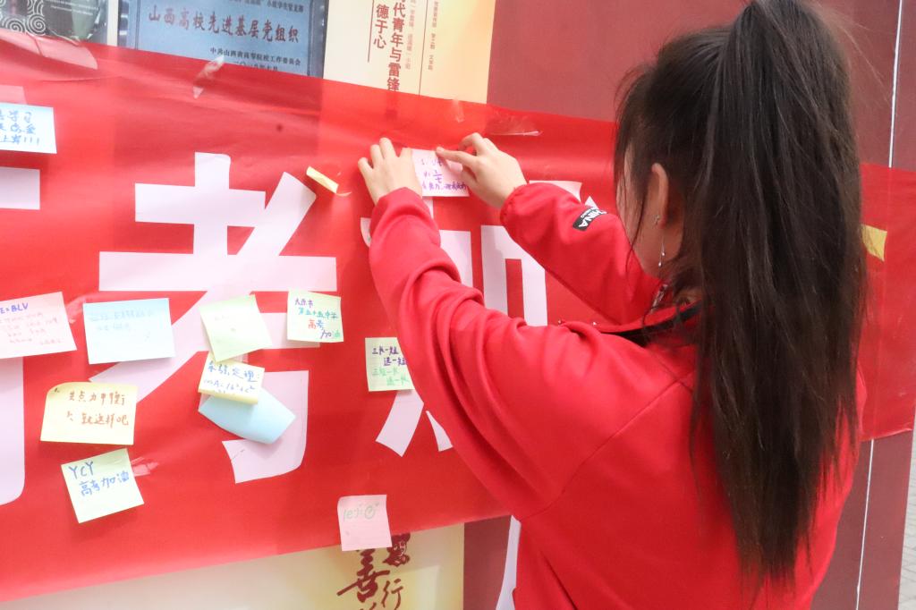 活动中,同学们通过录制高考加油视频、写便签的方式为高考学子出谋划策提建议,祝福他们如愿考上心仪的大学。 祝福语中“十年磨一剑,六月剑锋现”,“鹰击天风壮,鹏飞海浪春”,“一马当先,再创辉煌”,“拼一载春秋,搏一生无悔”,句句都融入了同学们的心声,燃起了考生热血拼搏的激情。