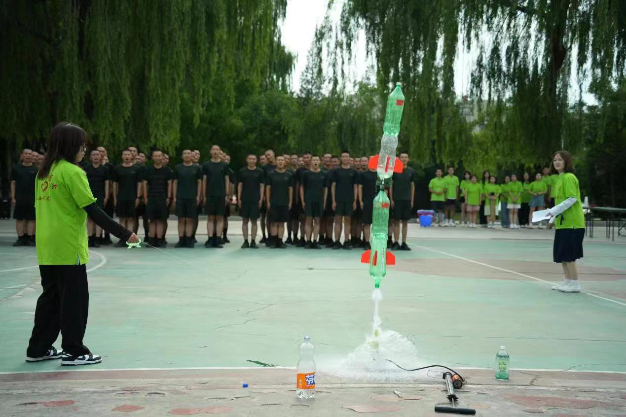 活动中,同学们从日常生活现象出发,选取最为贴近部队生活的物理知识内容进行科普宣传。在科普实验过程中,同学们邀请战士们亲自参与并共同完成蛇形摆实验、空气炮实验、水火箭实验、马德堡半球实验等众多互动性实验。拉近了战士们与同学们间的距离,带大家学习生活中的物理知识,解决日常生活中的困难,现场气氛热烈。