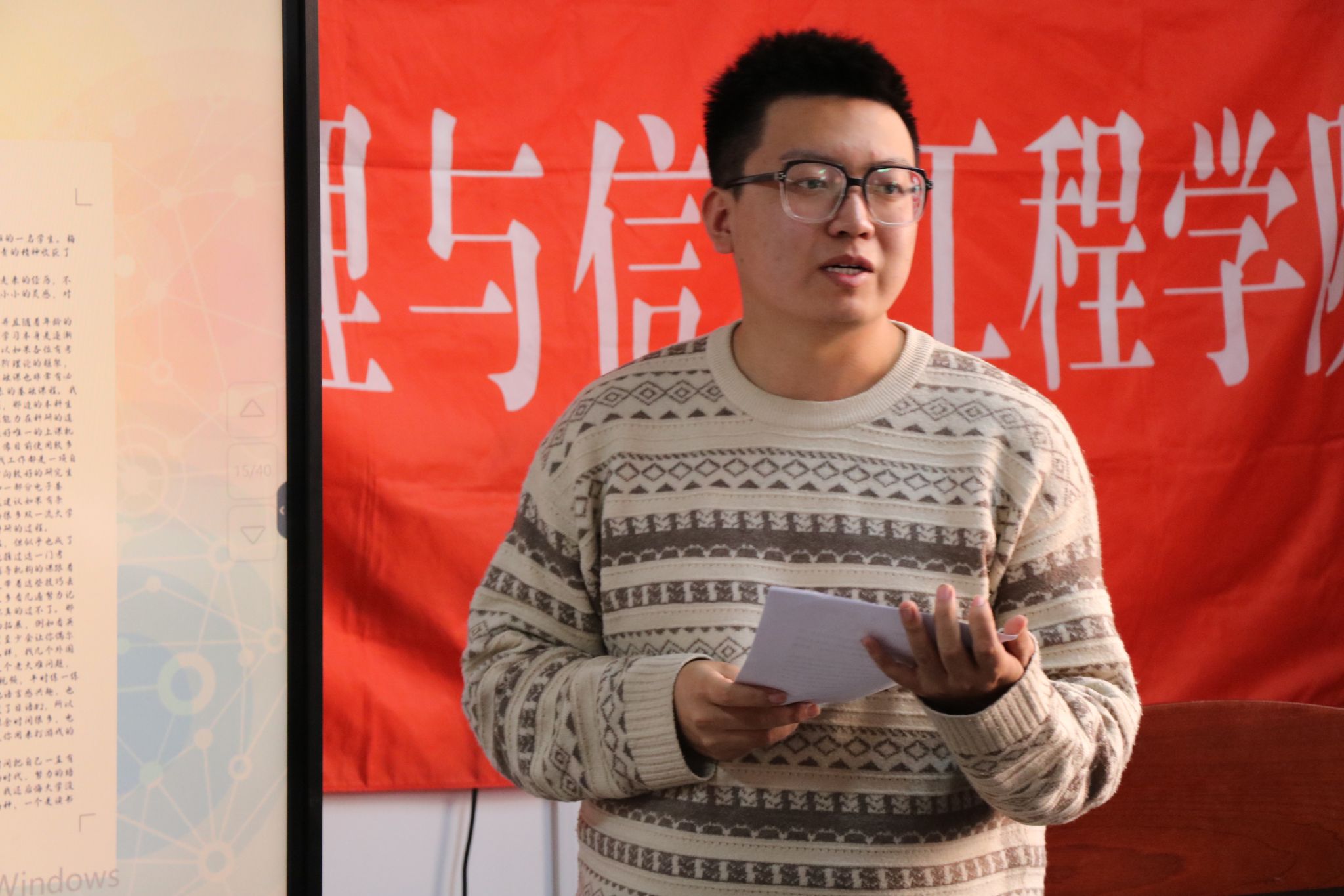 会上,20级、21级、22级各班以PPT展示和班级负责人讲解相结合的方式对上一学年班级在思想文化建设、班风学风建设、文体活动开展和班级所获荣誉等方面的做法和成果进行了汇报交流,对各项工作作出总结和反思,同时还对本学年的工作进行了展望。会议最后,曾荣获校级先进班集体、校级先进团支部的2004班班长王泽辉就如何开展班级工作从思想建设、组织建设、学风建设、文化建设等方面进行了经验分享与总结,同时也分享自己担任4年班长的心路历程,希望同学们珍惜身为员工干部的时光,因为每段经历都是成长。