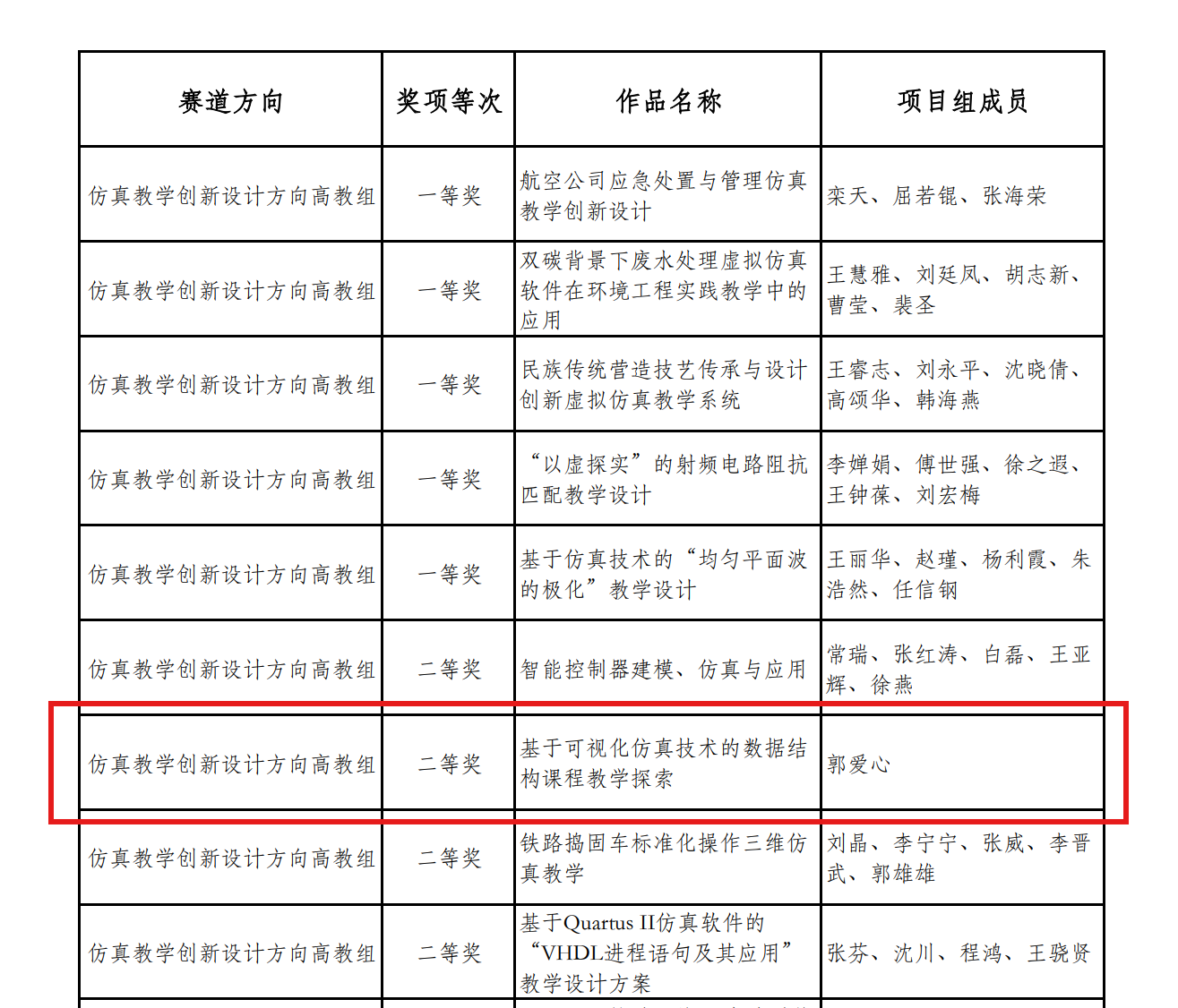 11月22日至25日,2024年全国仿真创新应用大赛全国总决赛在西北工业大学举行。本次大赛设有智能装备仿真、仿真教学应用、仿真创新设计、数字建模与智能决策、复杂系统数字仿真、化工仿真创新、医学仿真应用等7大赛道。公司郭爱心老师的作品《基于可视化仿真技术的数据结构课程教学探索》荣获仿真教学应用赛道仿真教学创新设计方向高教组全国二等奖。