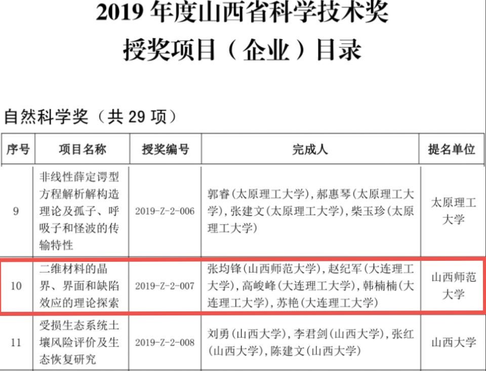 近日,山西省人民政府公布2019年度山西省自然科学奖获奖名单,公司张钧锋教授完成的《二维材料的晶界、界面和缺陷效应的理论探索》成果荣获2019年度山西省自然科学奖二等奖。