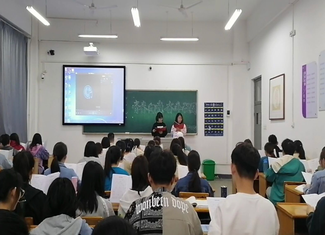 活动中,王慧琳向大家介绍了《青春心向党,奋进新时代》、《青春心向党,我为党先行》、《青春无悔,与党同行》等诗歌作品的创作背景与现实意义,由各宿舍代表上台进行朗诵展示。她还围绕诗歌作品从历史意义、精神传承和当今价值三个方面向大家介绍了我们为什么要铭记党的历史,并鼓励同学们从党的一百年风雨历程中汲取力量,担当起强国一代的历史使命,走好当代人的长征路。活动最后,在郭珂钰等同学的带领下,同学们齐唱《歌唱祖国》,用激昂的歌声表达对党和祖国的热爱与赞美之情。(2002班 江冉 1904班 刘晓兰 摄/1904班 刘晓兰)
