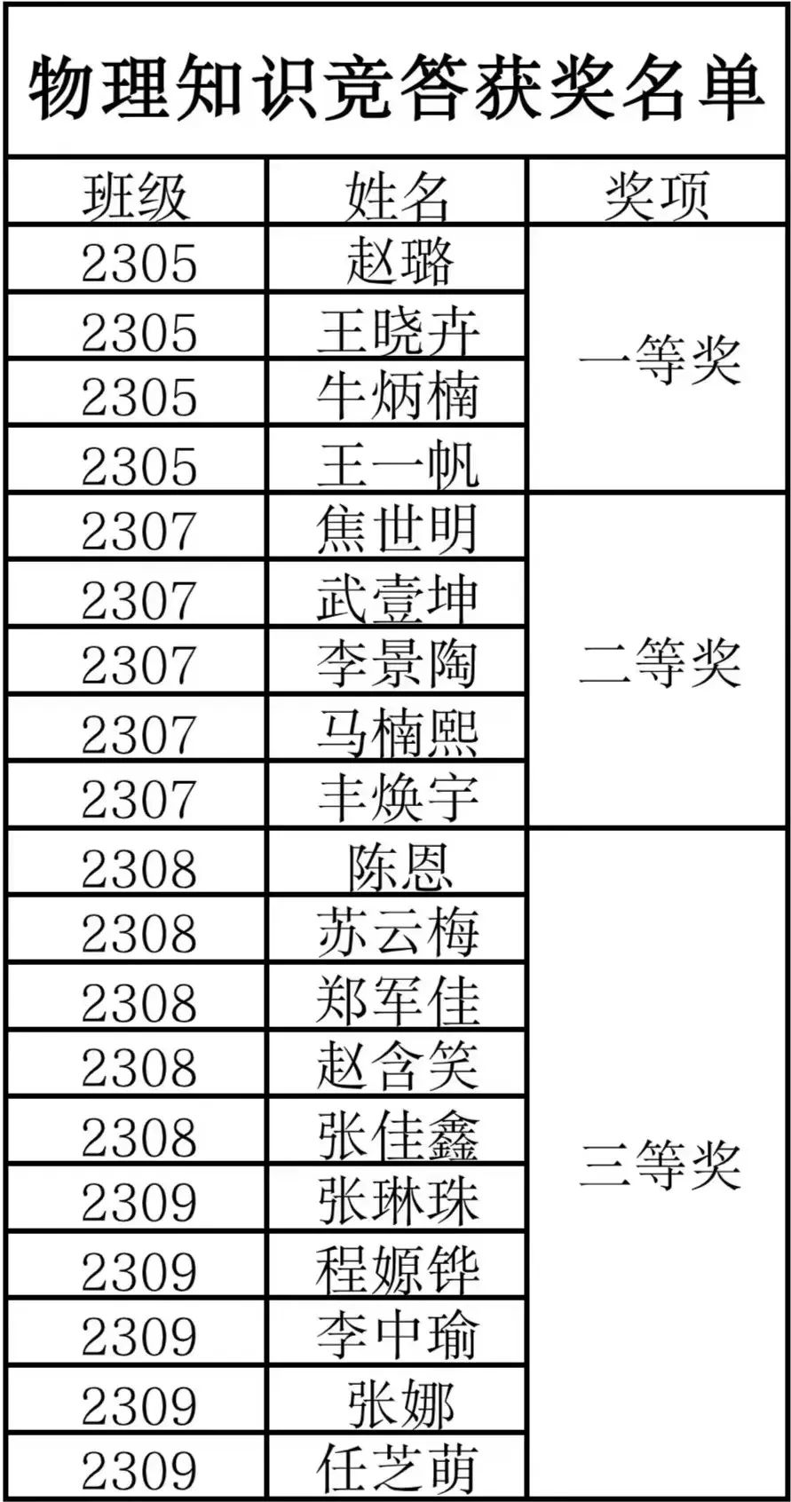 活动分为顺序回答和抢答两个环节,两项成绩相加为本小组的最终成绩。顺序回答环节,同学们沉着应对,自信十足,充分体现了同学们扎实的物理基础知识理论。抢答环节有十秒钟的题目展示,各小组比知识,拼策略,竞答现场气氛热烈,知识的火花不断迸发。经过两轮竞答,共评选出一等奖四名,二等奖五名,三等奖十名。