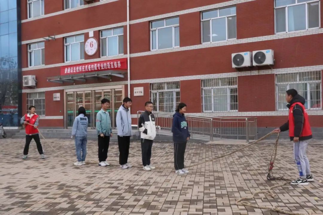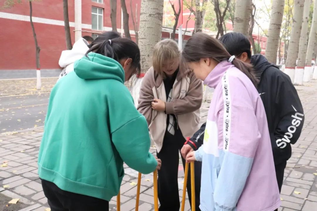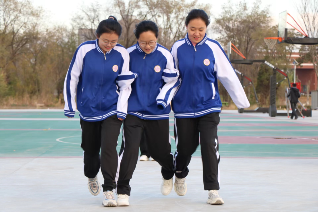 绳绑双腿,手搭双肩,向前跑一来回,用时短的队伍胜利。同学们团结协作、相互配合,让队伍步调一致,走向成功。