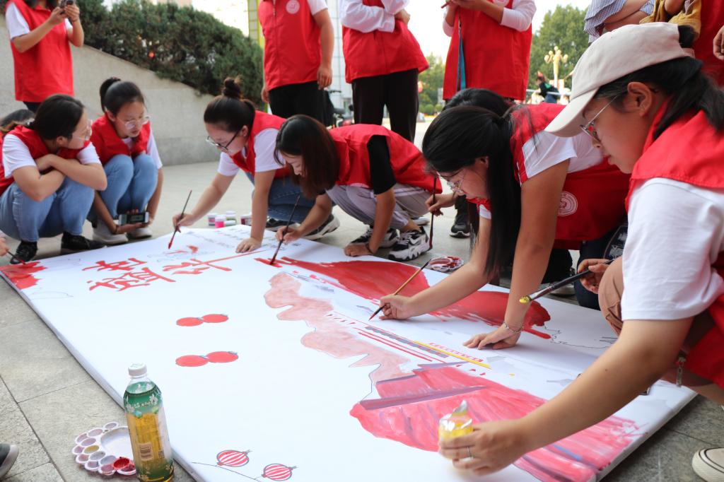 支部党员分为6组,齐聚巨人广场,在平铺的画布上,用手中的画笔,手绘祖国。活动中,同志们热情高涨,认真绘制,“国旗、天安门、灯笼、山”逐步成型。最后,构成了一幅庆祝新中国成立70周年的“巨画”。